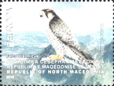 Auf einer Europamarke 2019 (MiNr 876) aus Makedonien (Nordmazedonien) wird ein Lannerfalke (Falco biarmicus) gezeigt.