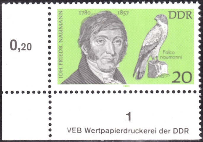 Auf einer Marke aus der DDR (MiNr 2494) sehen wir ein Porträt von Johann Friedrich Naumann und einen Rötelfalke (Falco naumanni). Hier zeige ein Eckrandstück mit einem Teil des Druckvermerkes.
