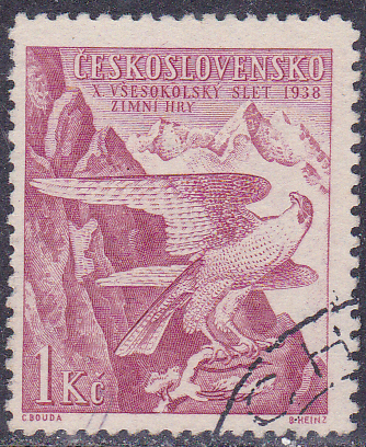 Auf den zwei Marken aus der Tschechoslowakei zu den 10. Sokol-Winterspiele in der Hohen Tatra ist ein Wanderfalke (Falco peregrinus) abgebildet.