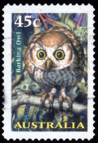 Auf dieser selbstklebenden Marke aus Australien (MiNr 1670) ist ein Kläfferkauz (Ninox connivens) abgebildet. Im Michel wird er Bellhabichtskauz (Ninox connivens) genannt
