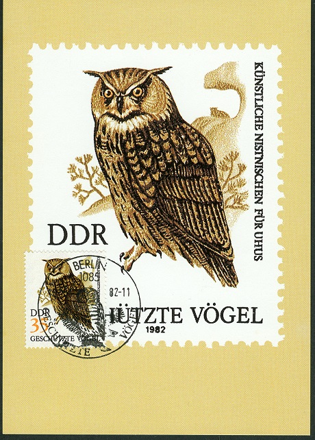 Das weiter oben bereits vorgestellte Uhu-Motiv aus dem DDR-Jahr 1982 auf einer MaxiCard samt Ersttagssonderstempel.