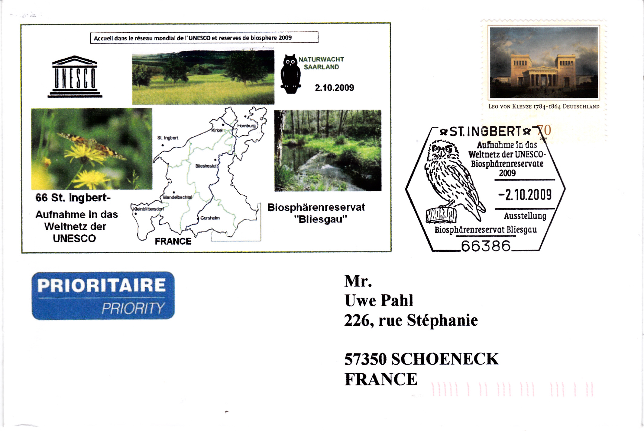 Dieser Sonderstempel vom 2.10.2009 aus St. Ingbert zeigt im Stempelbild einen Steinkauz.