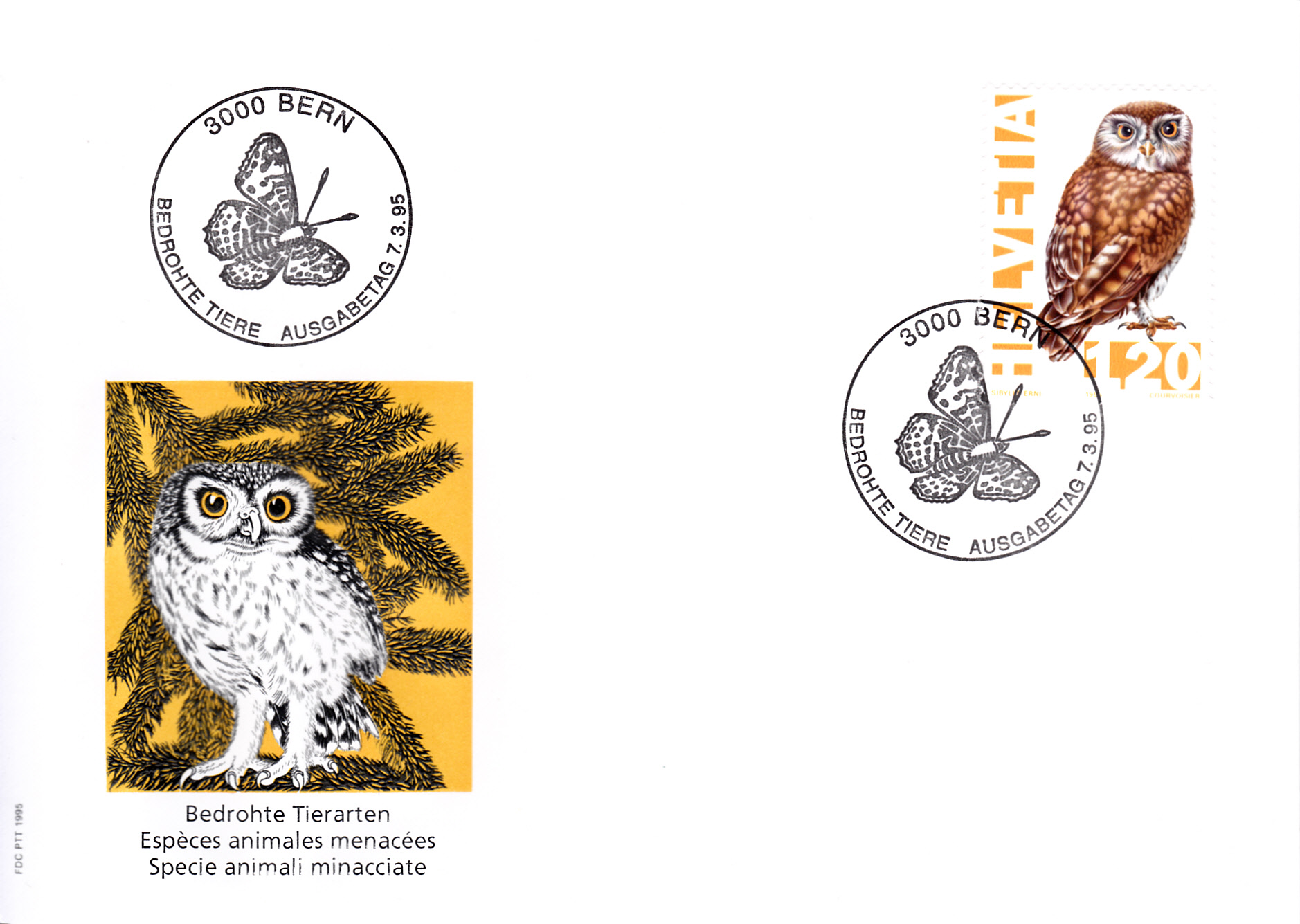Aus einer Serie "Bedrohte einheimische Tiere" der Schweiz kommt diese Marke (MiNr 1547) mit einem Steinkauz (Athene noctua).