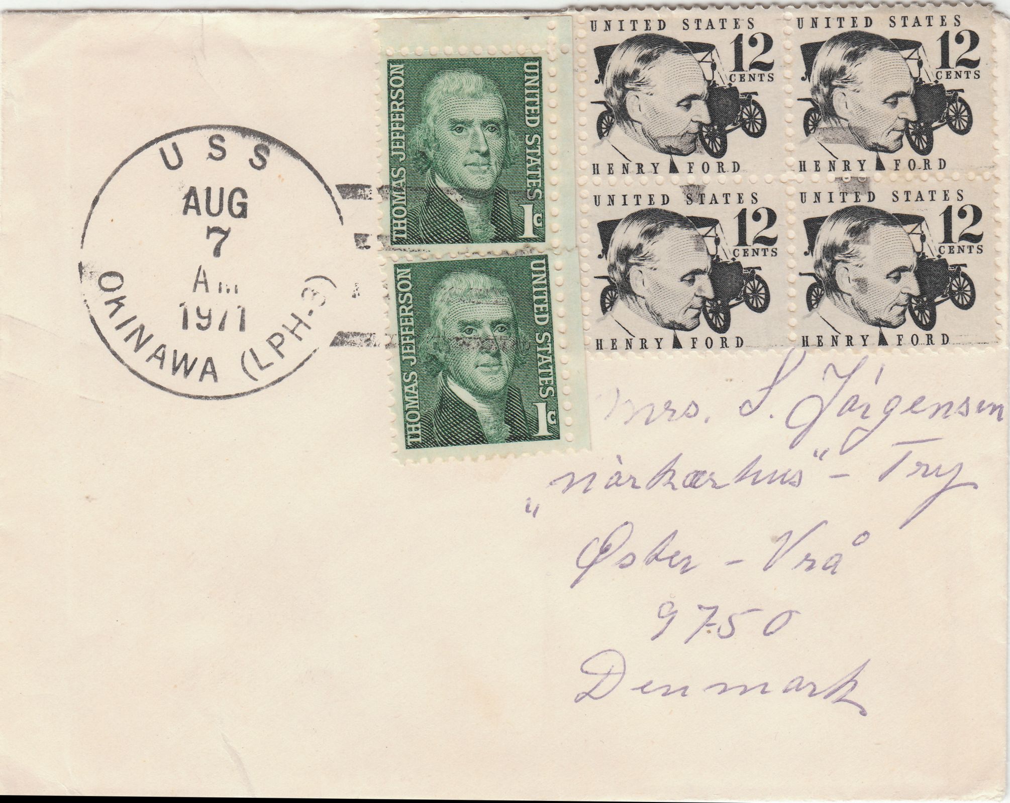 Brief nach Dänemark mit Entwertungsstempel der USS OKINAWA (LPH-3) vom 07.08.1971: