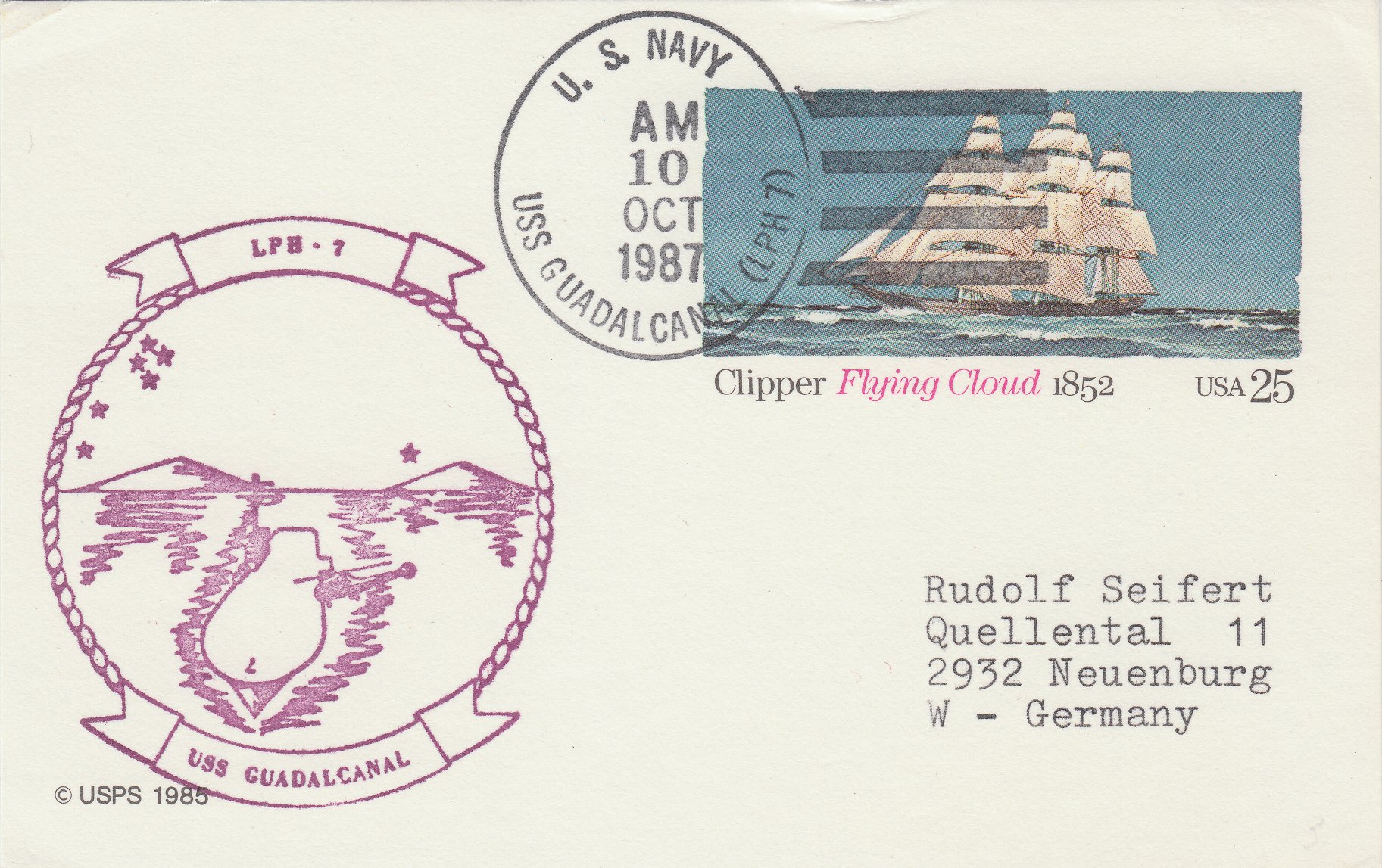 Dieser Beleg vom 10.10.1987 zeigt den Cachetstempel des Schiffes in Lila: