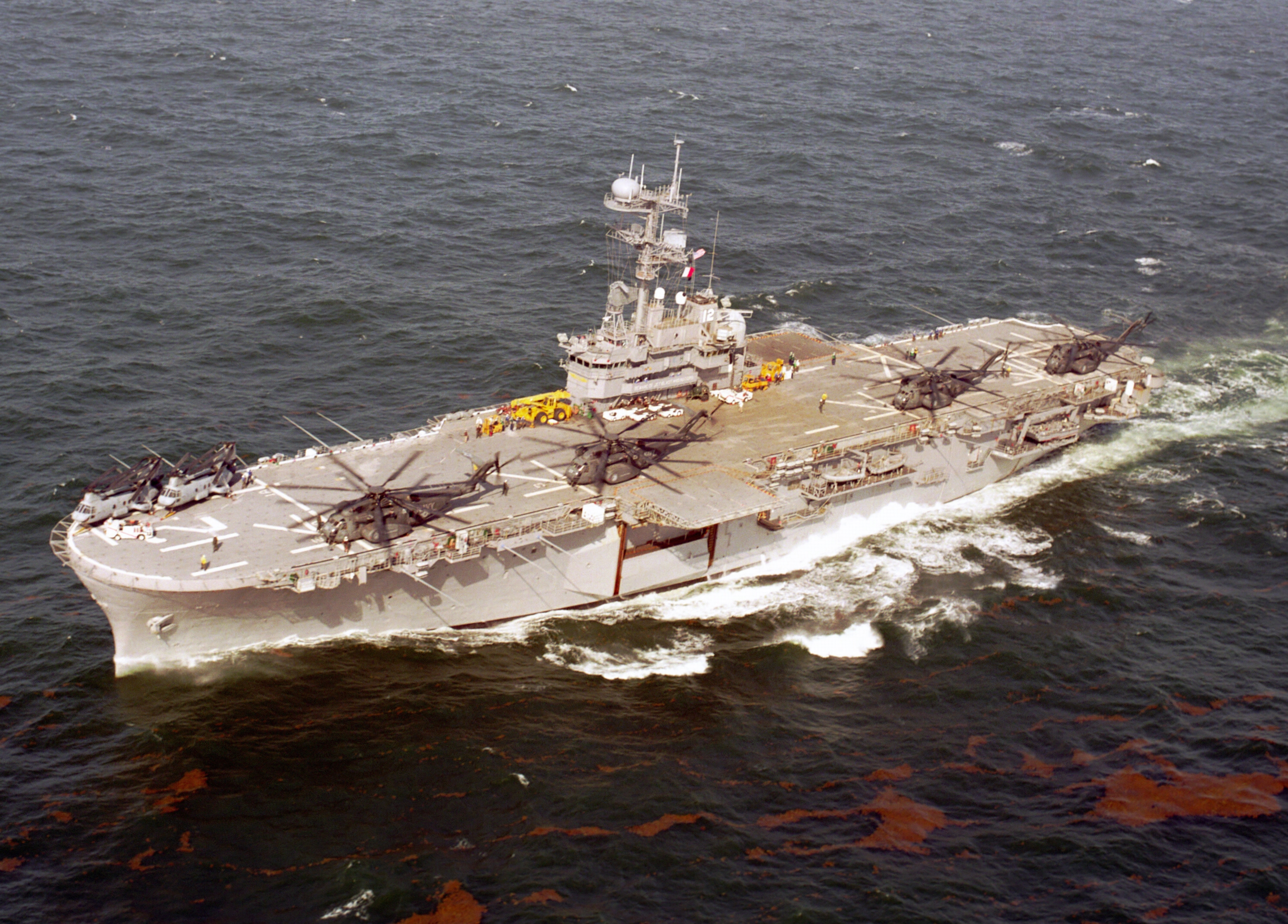 Hier eine Abbildung, die das Schiff 2001 im Golf vom Mexico zeigt. Auf dem Flugdeck erkennt man zwei Boeing CH-46 Sea Knight und vier Sikorsky MH-53E Sea Dragon Hubschrauber.