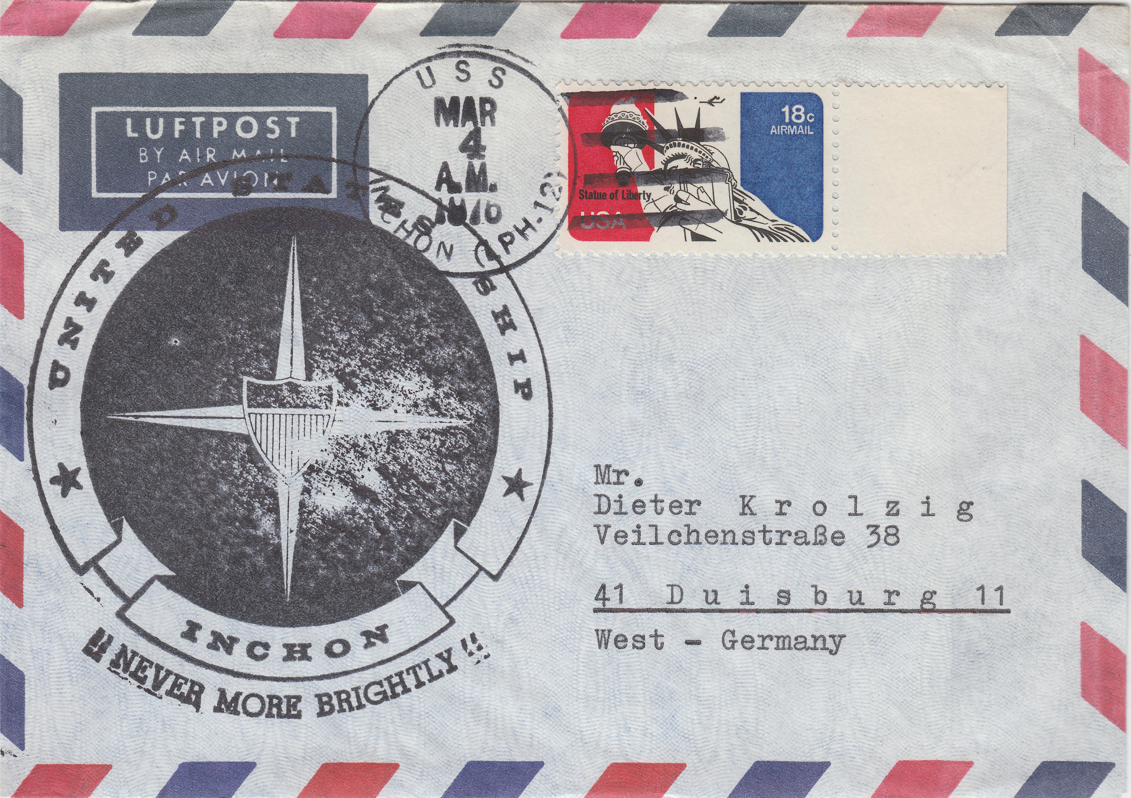 Diese beiden Belege wurde am 04.03.1976 an Bord des Schiffes entwertet und tragen einen Cachetstempel in Schwarz mit dem Motto des Schiffes