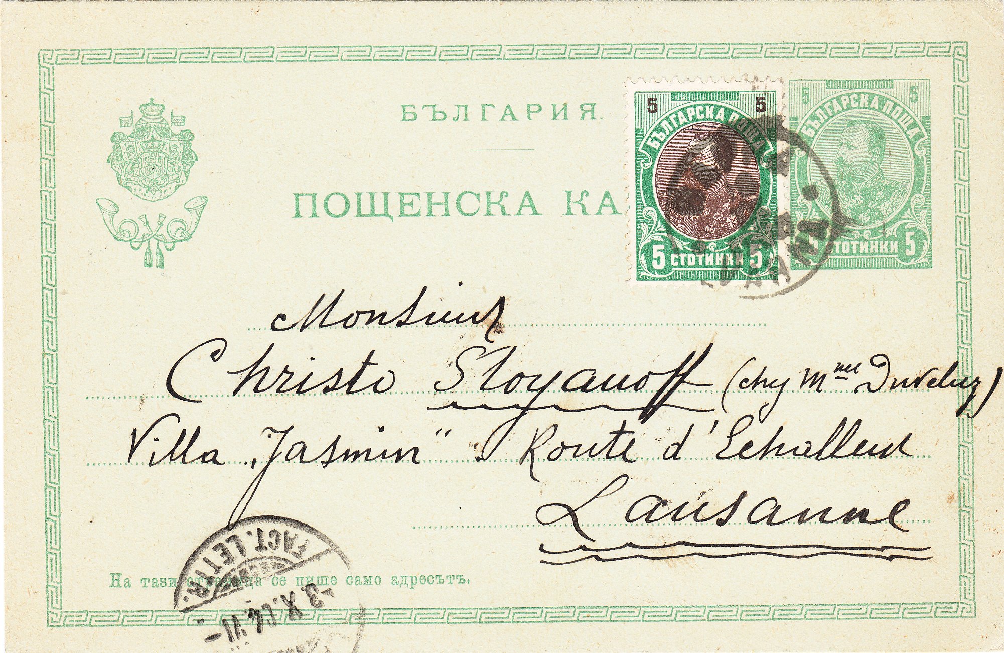 Diese Ganzsache P 18 in der Druckfarbe grün auf rahmfarbenem Karton wurde 1904 mit einer MiNr. 53 als passender Zusatzfrankatur in Varna aufgegeben und lief nach Lausanne in die Schweiz: