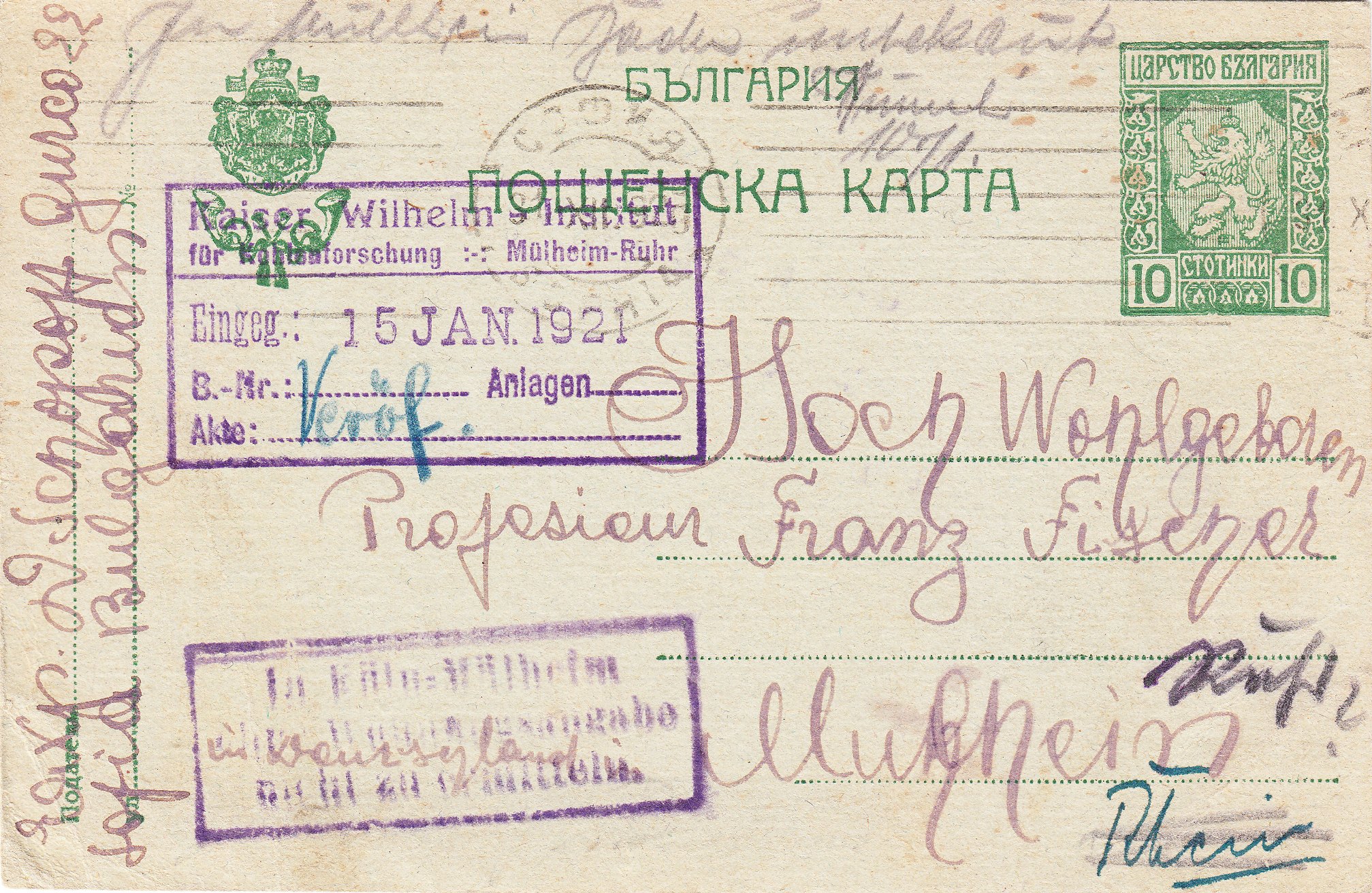 Diese Ganzsache mit Eindruck einer Freimarke zu 10 Stotinki mit dem Motiv des bulgarischen Wappenlöwen wurde am 31.12.1920 in Sofia aufgegeben: