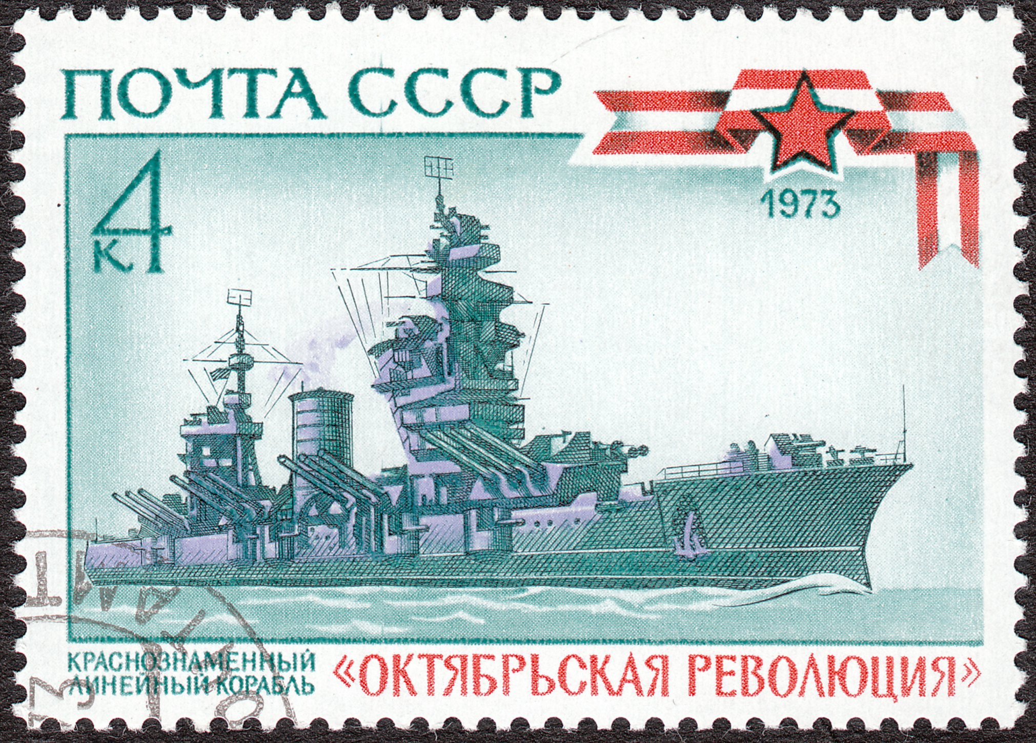 Am 12.09.1973 erschien in der Sowjetunion eine Sonderausgabe zur "Geschichte der Kriegsflotte", die aus 5 Werten bestand, dabei als Wertstufe zu 4 Kopeken diese Marke mit einer Ansicht der OKTOBERREVOLUTION = Октябрьская революция: