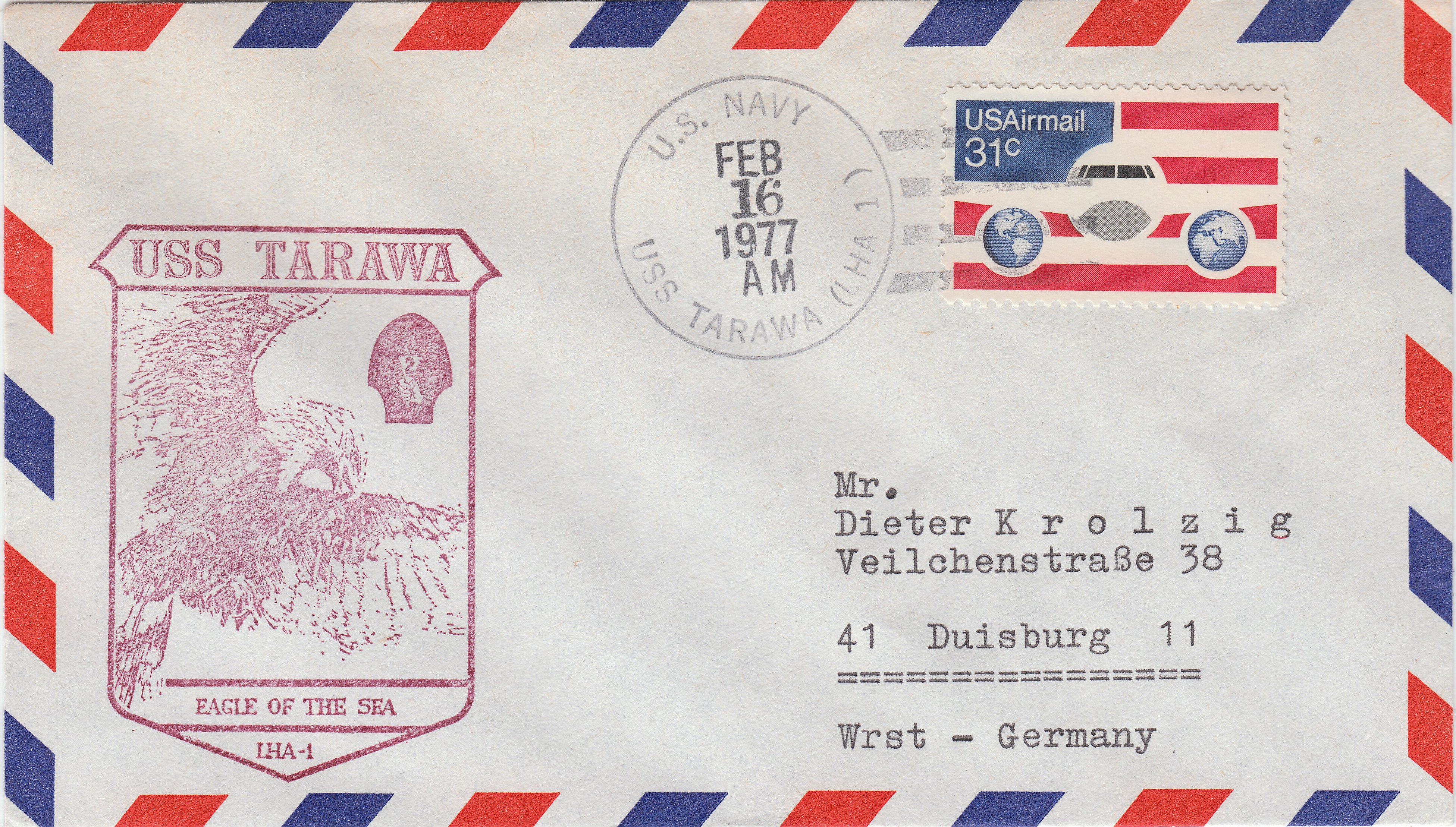 Dieser Beleg vom 16.02.1977 wurde mit dem Bordpoststempel des Schiffes entwertet und trägt einen Cachetstempel in Lila mit dem Motto des Schiffes EAGLE OF THE SEA nach dem Badge des Schiffes.