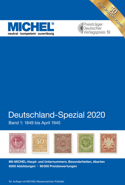 Der Deutschland-Spezial-Katalog 2020 – Band 1 (1849 bis April 1945) erscheint in der 50. Auflage in Farbe mit insgesamt 1216 Seiten im Format: 155 x 230 mm als Hardcover. Erstverkaufstag ist der 3. April 2020. Er kostet 89,90 €.