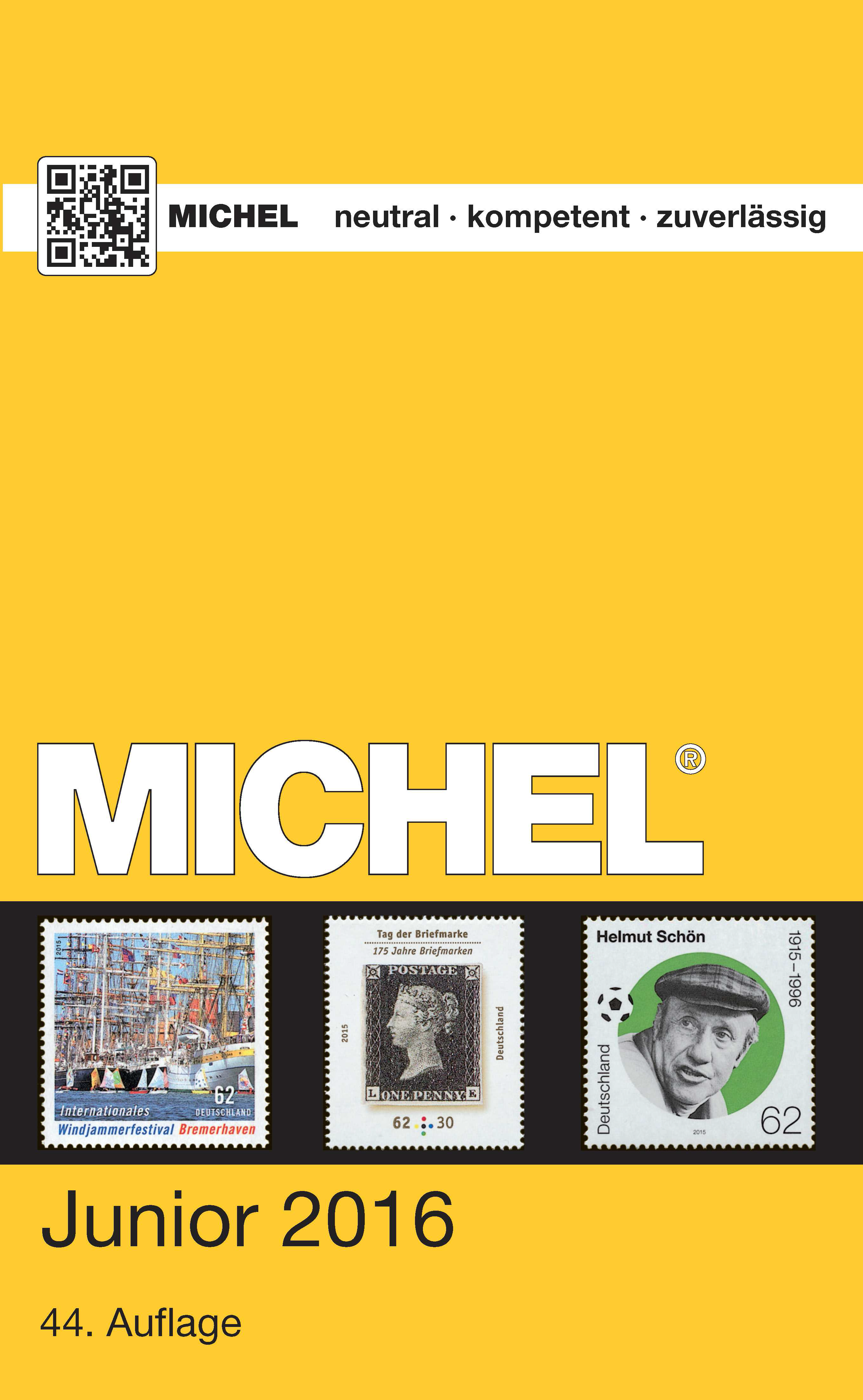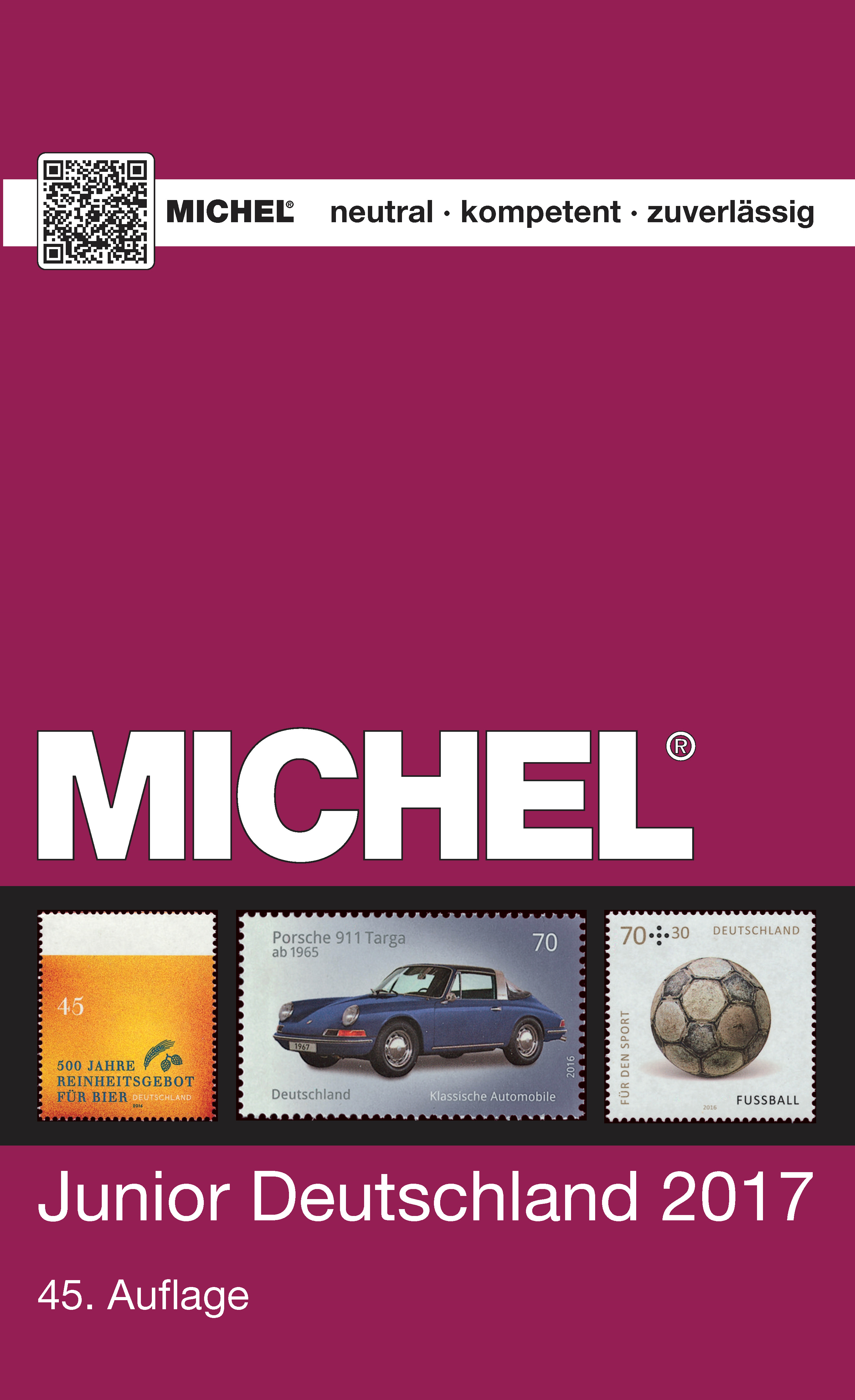 Am 4.Dezember erschien der Michel-Junior Deutschland-Katalog 2016 in der 44. Auflage in Farbe mit 618 Seiten im Format 155 x 188 mm kartoniert. Der Katalog kostet in der Papierform 9,95 € und in der MICHEL-Online-Bibliothek 8,90 €. Er enthält folgende Markenausgaben: Altdeutschland, Deutsches Reich, Auslandspostämter, Kolonien, Besetzungsausgaben des Ersten und Zweiten Weltkrieges, Abstimmungsgebiete (mit Saargebiet), Danzig, Memel, Böhmen und Mähren, Generalgouvernement, Sudetenland, Feldpostmarken, Lokalausgaben, Alliierte Besetzung (Gemeinschaftsausgaben, Berlin und Brandenburg, SBZ, Französische Zone, Amerikanische und Britische Zone), DDR, Berlin (West), Saarland und BRD.
