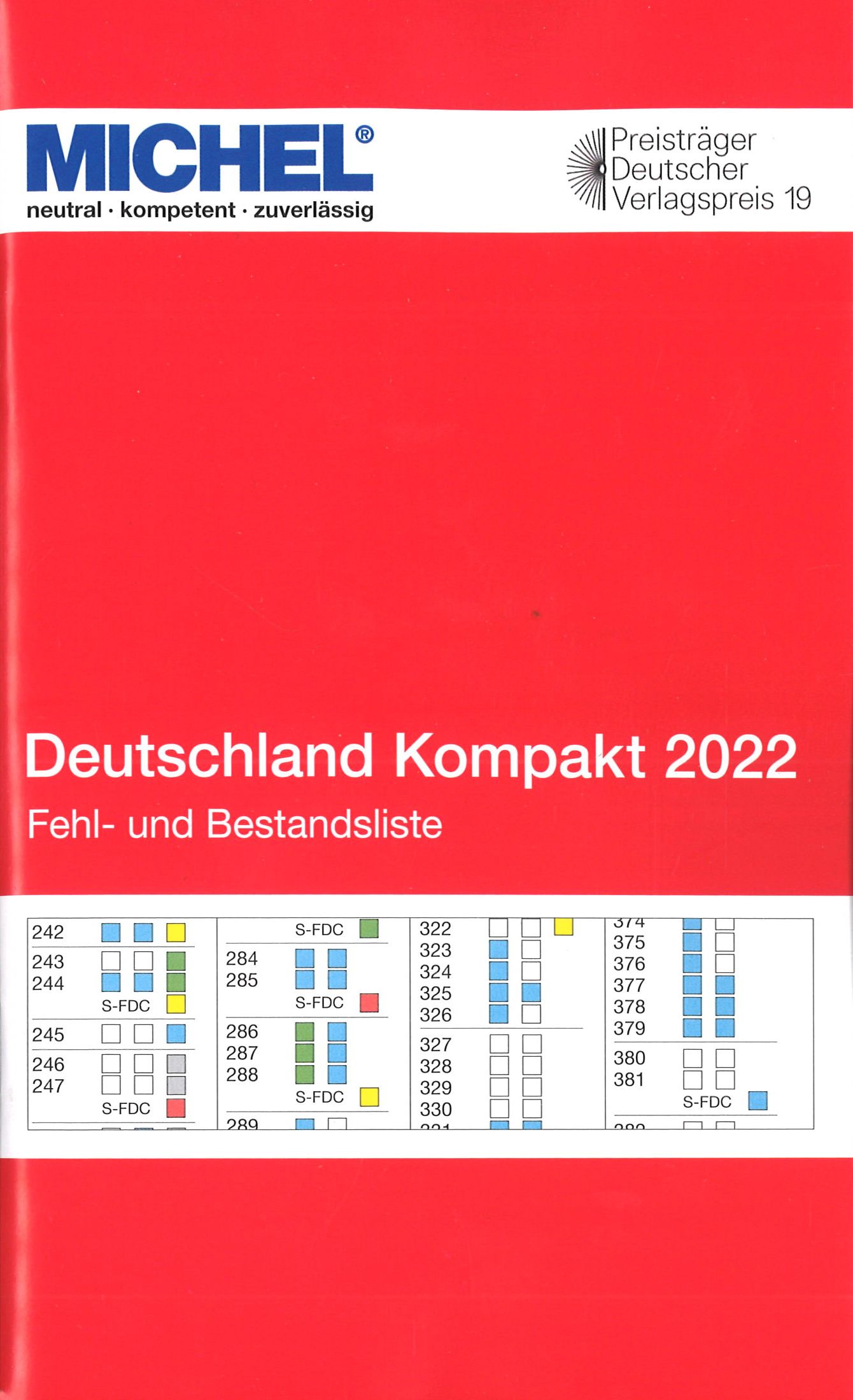 Am 3.Dezember 20201erschien der Deutschland Kompakt 2022, der neue Junior, in der 50. Auflage in Farbe mit 680 Seiten im Format 115 x 188 mm kartoniert. Der Katalog kostet in der Papierform 15,00 €. Er enthält folgende Markenausgaben: Altdeutschland, Deutsches Reich, Auslandspostämter, Kolonien, Besetzungsausgaben des Ersten und Zweiten Weltkrieges, Abstimmungsgebiete (mit Saargebiet), Danzig, Memel, Böhmen und Mähren, Generalgouvernement, Sudetenland, Feldpostmarken, Lokalausgaben, Alliierte Besetzung (Gemeinschaftsausgaben, Berlin und Brandenburg, SBZ, Französische Zone, Amerikanische und Britische Zone), DDR, Berlin (West), Saarland und BRD.
