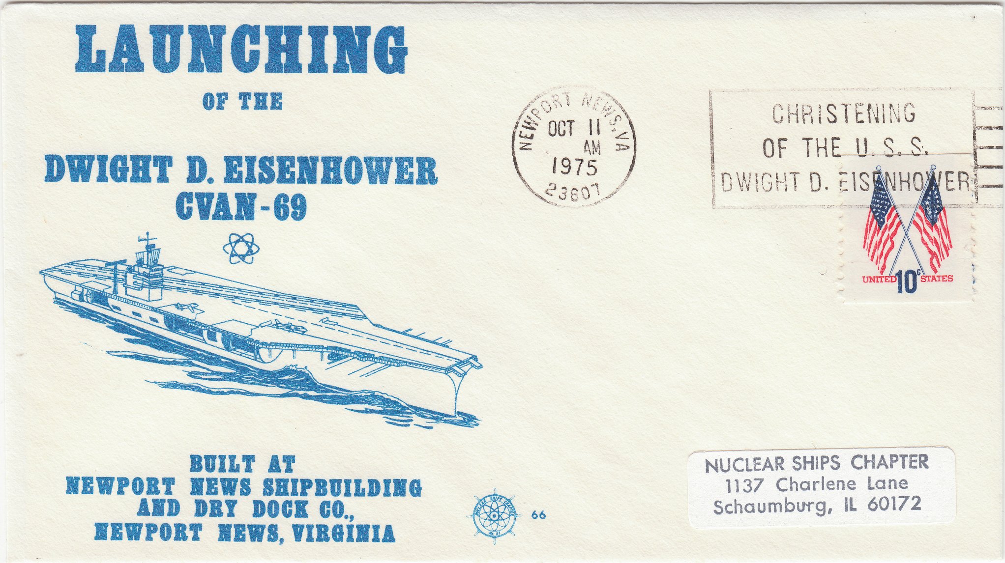 Dieser Beleg dokumentiert per Maschinenstempel die Taufe des Flugzeugträgers der NIMITZ-Klasse USS DWIGHT D. EISENHOWER (CVN-69), die durch Mamie Geneva Doud Eisenhower, die Witwe des ehemaligen Präsidenten der USA vorgenommen wurde: