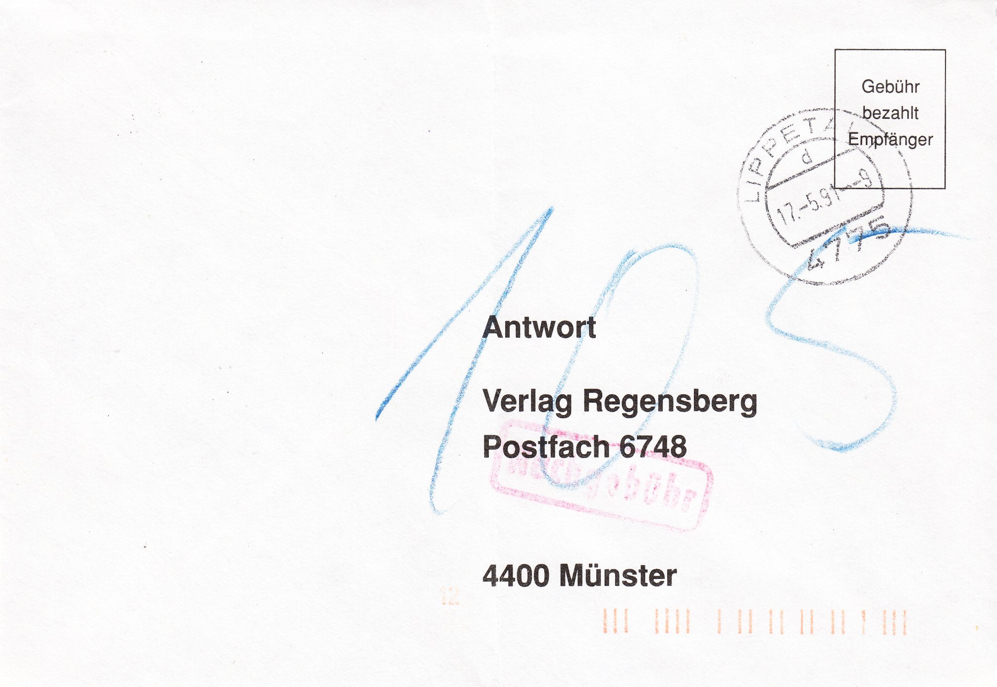 Ich vermute, dass diese 80 Pfennig vom Absender auch brav verklebt worden waren, wobei ein Postwertzeichen zu 50 Pfennig dann auf dieses Textfeld geklebt worden ist. Dieses Postwertzeichen ist jedoch von diesem Beleg abgefallen, bevor der Beleg durch die automatische Anlage lief, wo der Maschinenstempel abgeschlagen wurde, denn man erkennt noch Kleberreste an dieser Stelle des Umschlags.