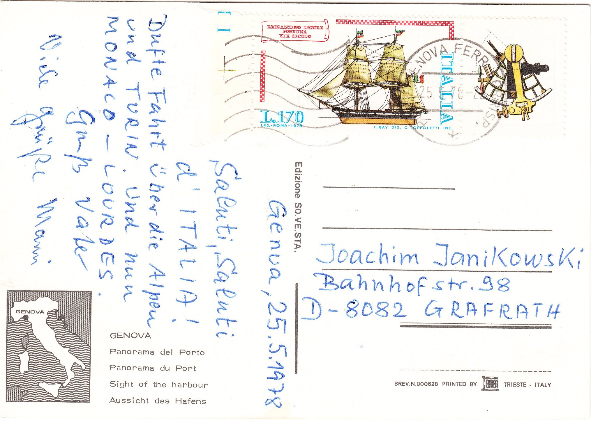 Dieses Postwertzeichen aus Italien zeigt eine Brigantine, die "BRIGANTINE LIGURE FORTUNA" aus dem 19. Jahrhundert, hier mit Zierfeld sowie linkem Bogenrand mit Randzudruck:
