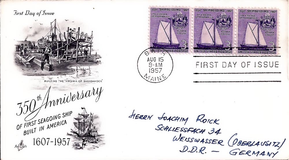 Anlaß: 350 Jahre Schiffsbau in Amerika 1607-1957, dargestellt ist das Segelschiff „Virginia of Sagadahock“