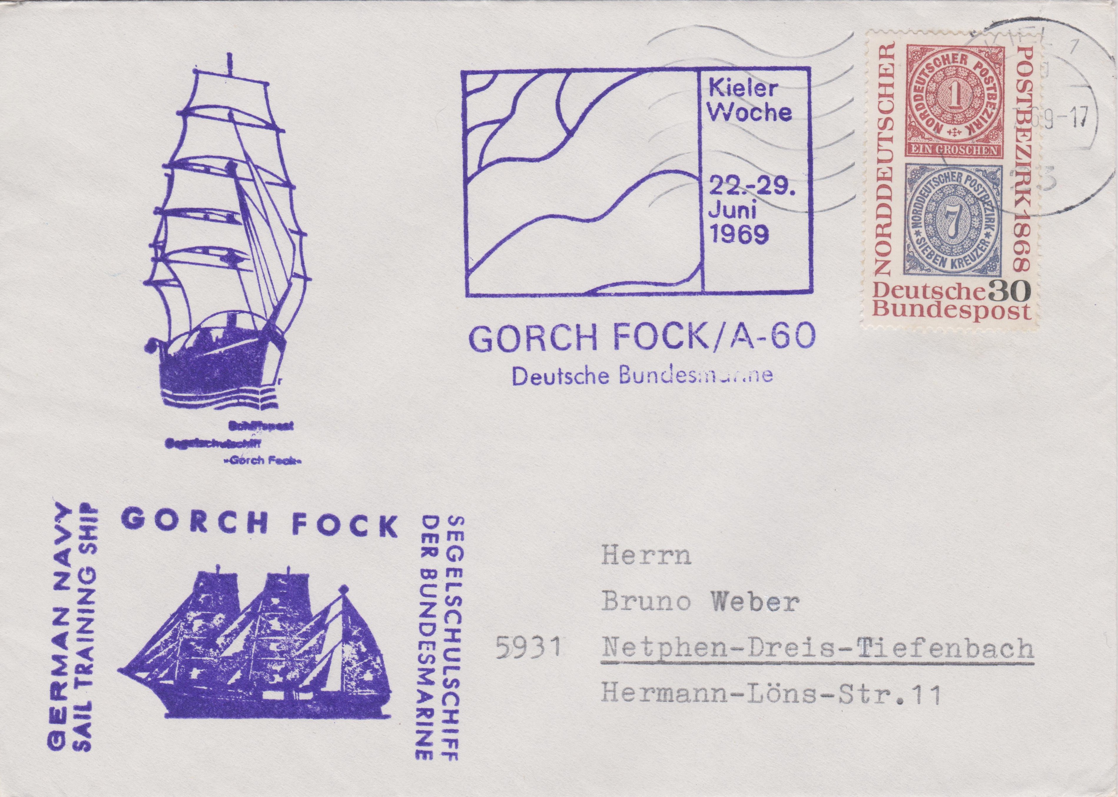 An der KIELER WOCHE 1969 nahm die GORCH FOCK / A-60, das SEGELSCHULSCHIFF DER BUNDESMARINE teil, was diese zwei Belege dokumentieren:
