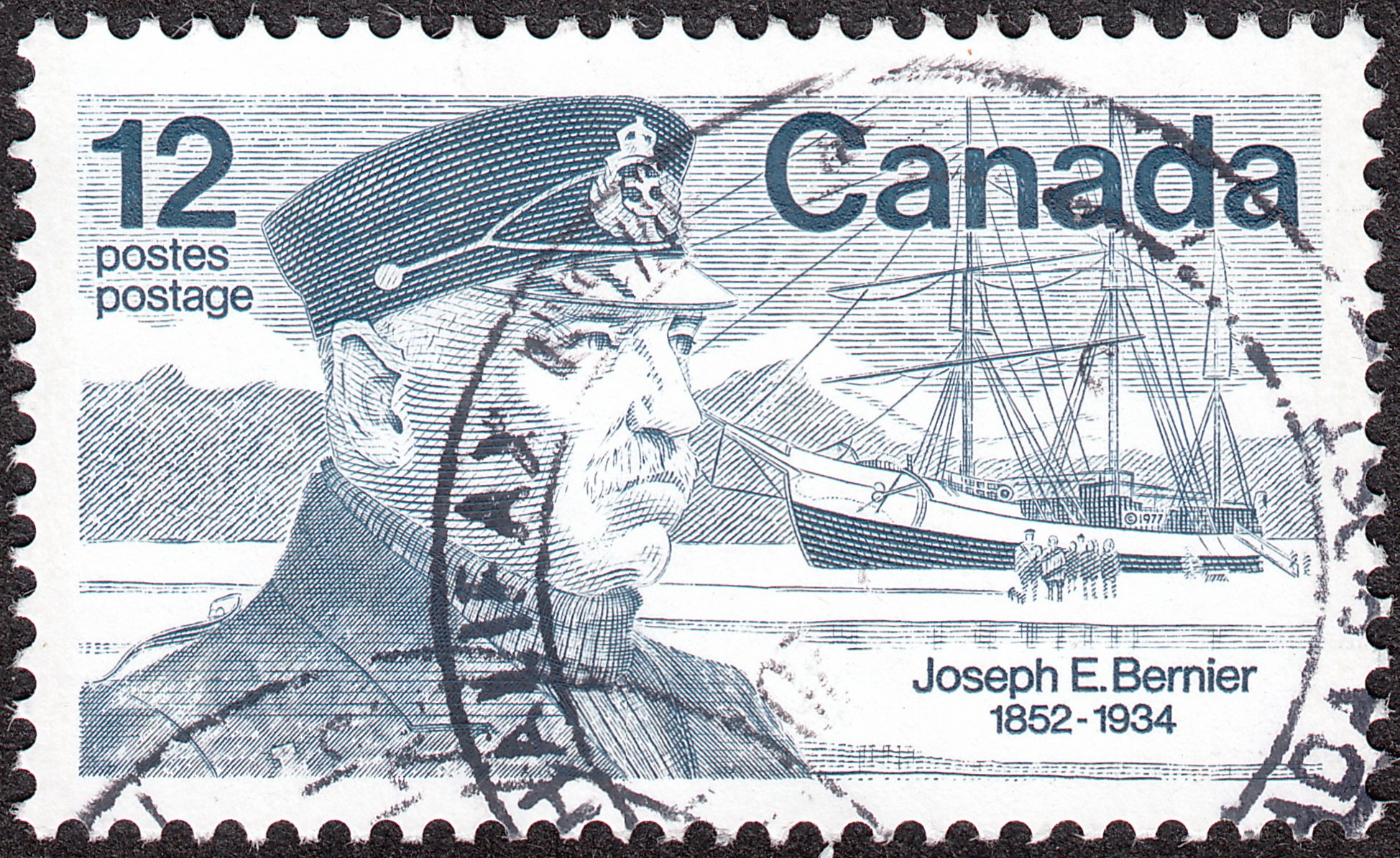 Dieses am 16.09.1977 in einer Auflage von 12 Millionen bei der British American Bank Note Company gedruckte Postwertzeichen zeigt Joseph E. Bernier und im Hintergrund die ARCTIC, wie sie während einer ihrer Überwinterungen im Eis feststeckt: