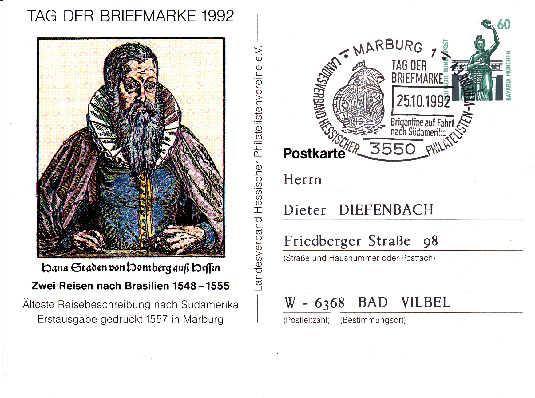Im Sonderstempel zum Tag der Briefmarke 1992 vom 25.10.1992 aus Marburg können wir eine Brigantine sehen.