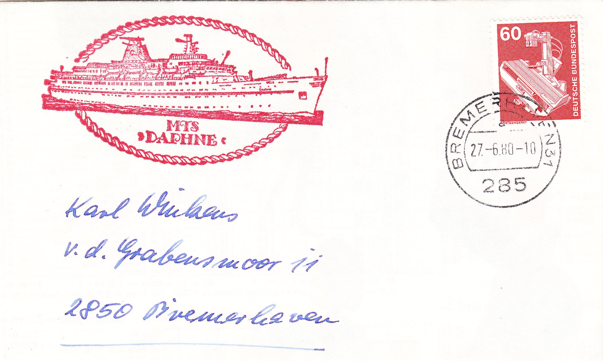 Diese zwei Belege entstanden 1980 bei einem Besuch des Schiffes in Bremerhaven. Beide zeigen den Cachetstempel des Schiffes in Rot: