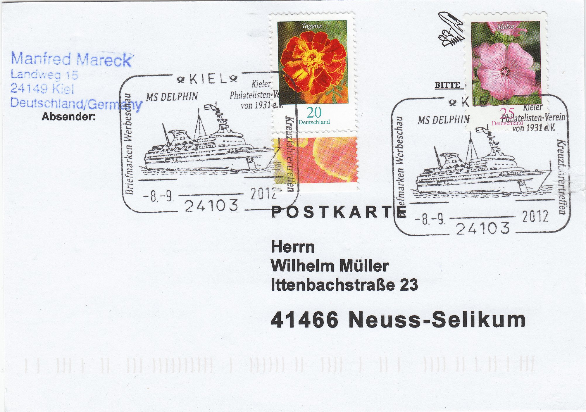 Zur Briefmarken Werbeschau des Kieler Philatelisten-Vereins wurde am 08.09.2012 dieser Sonderstempel aufgelegt, der die MS DELPHIN zeigt: