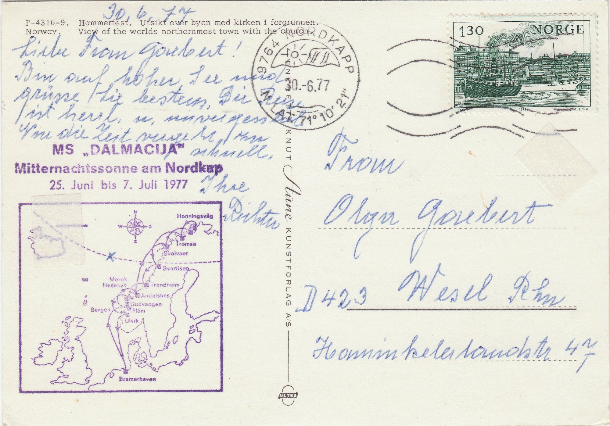 Diese Postkarte wurde während der vom 25.06.1977 bis 07.07.1977 dauernden Kreuzfahrt der MS DALMACIJA am 30.06.1977 am Nordkap,