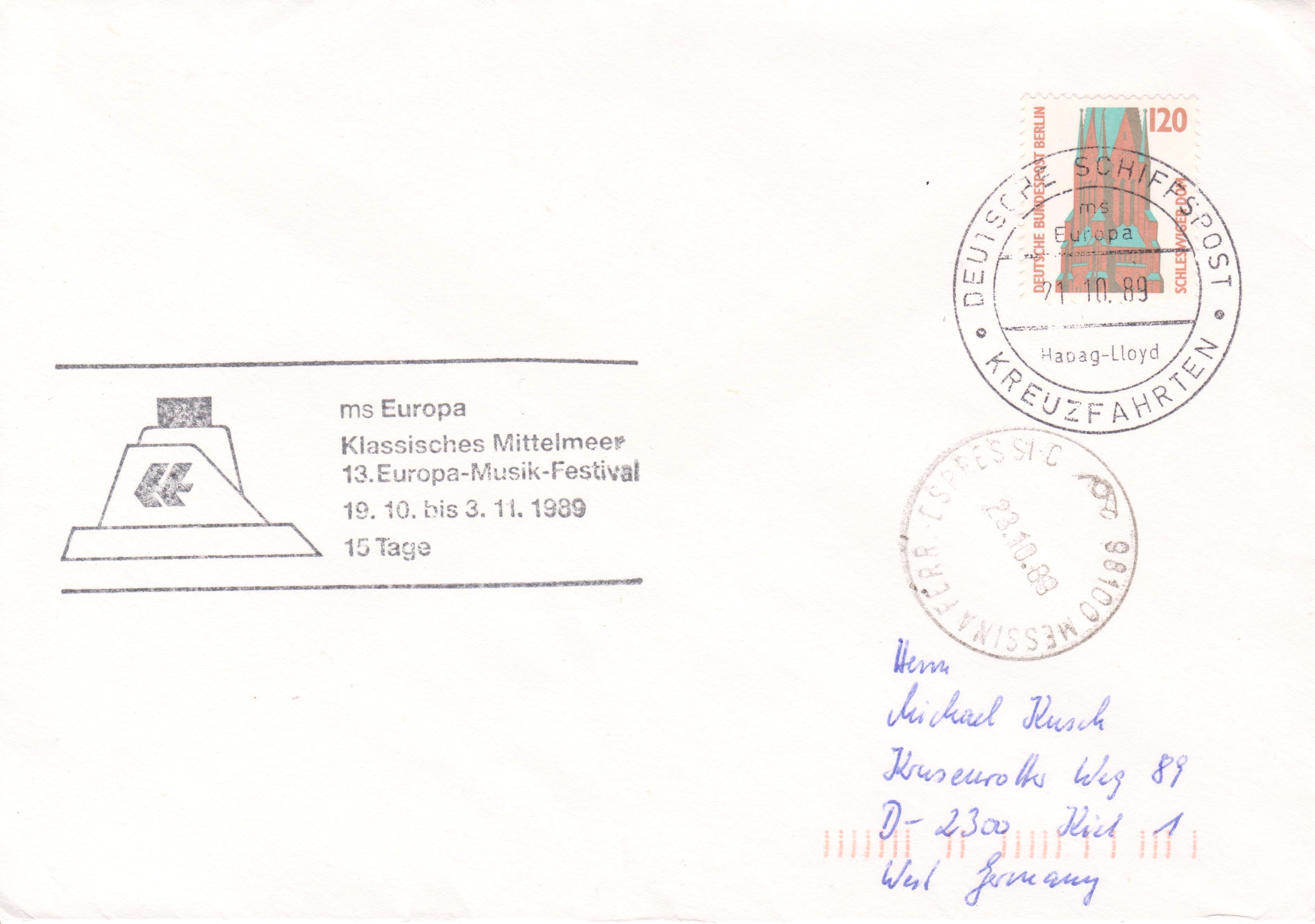 Brief, am 21.10.1989 aufgegeben an Bord der MS EUROPA: