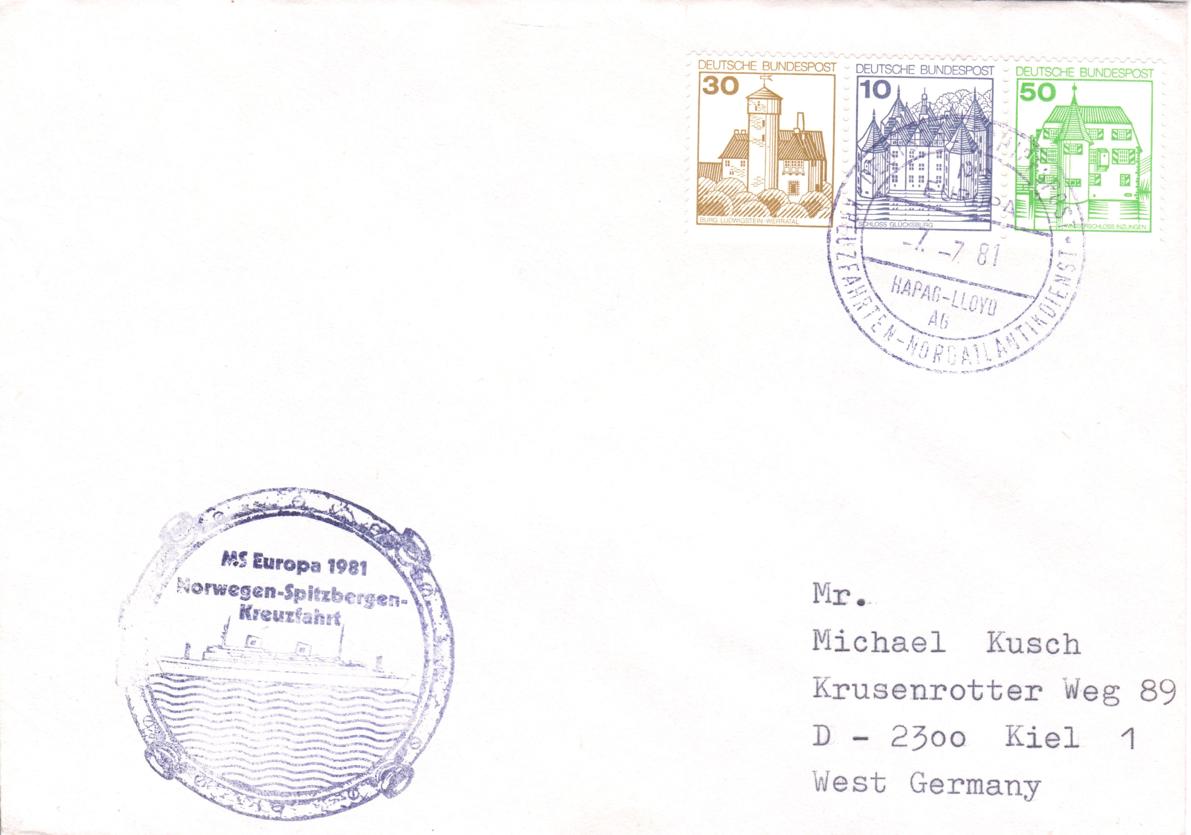 Brief, Portostufe 90 Pf, aufgegeben am 07.07.1981 an Bord der MS Europa aus Anlaß der "Norwegen-Spitzbergen-Kreuzfahrt":