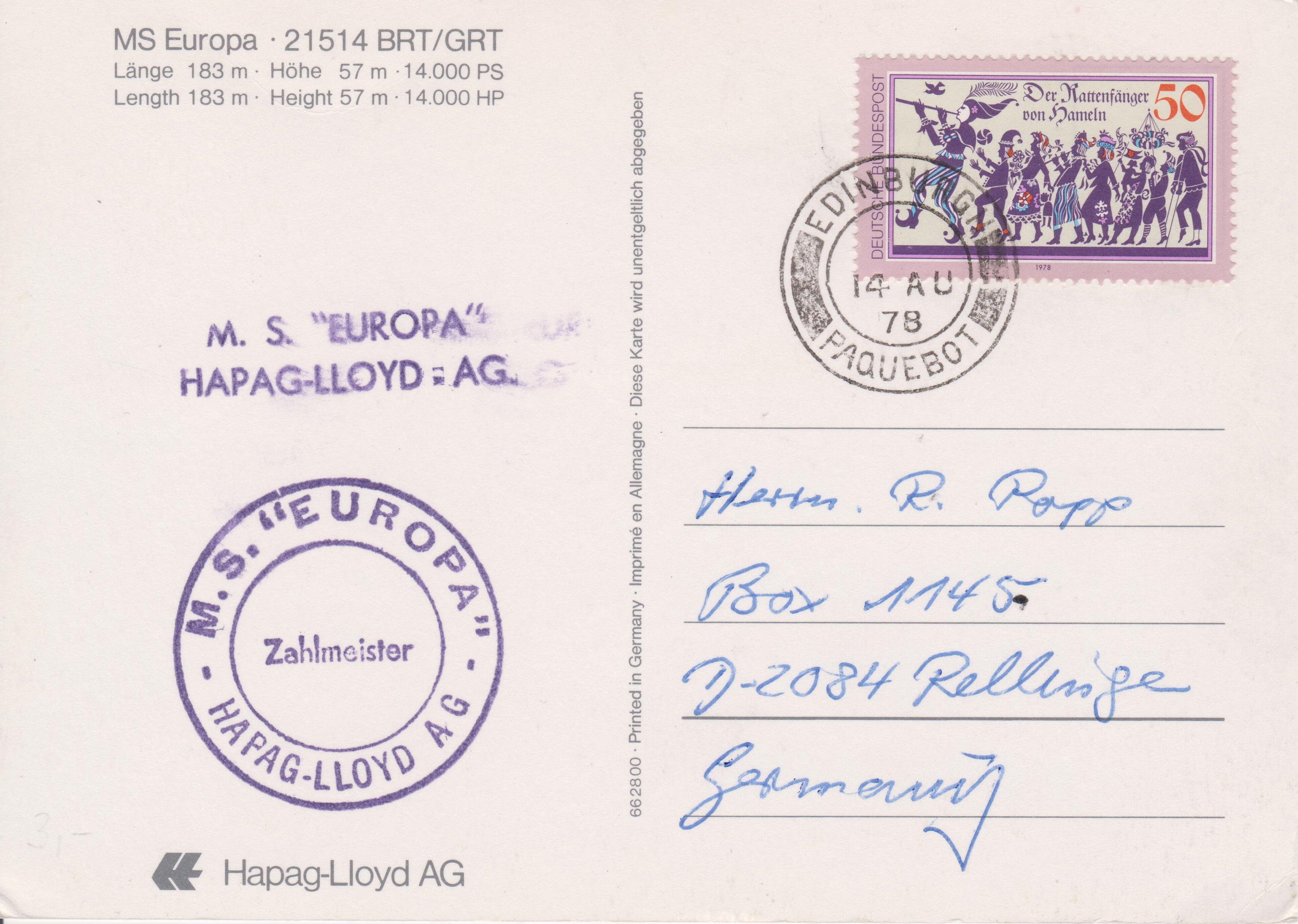 Ansichtskarte der MS Europa, mit 50 Pf frankiert an Bord aufgegeben und am 14.08.1978 der Post in EDINBURGH übergeben: