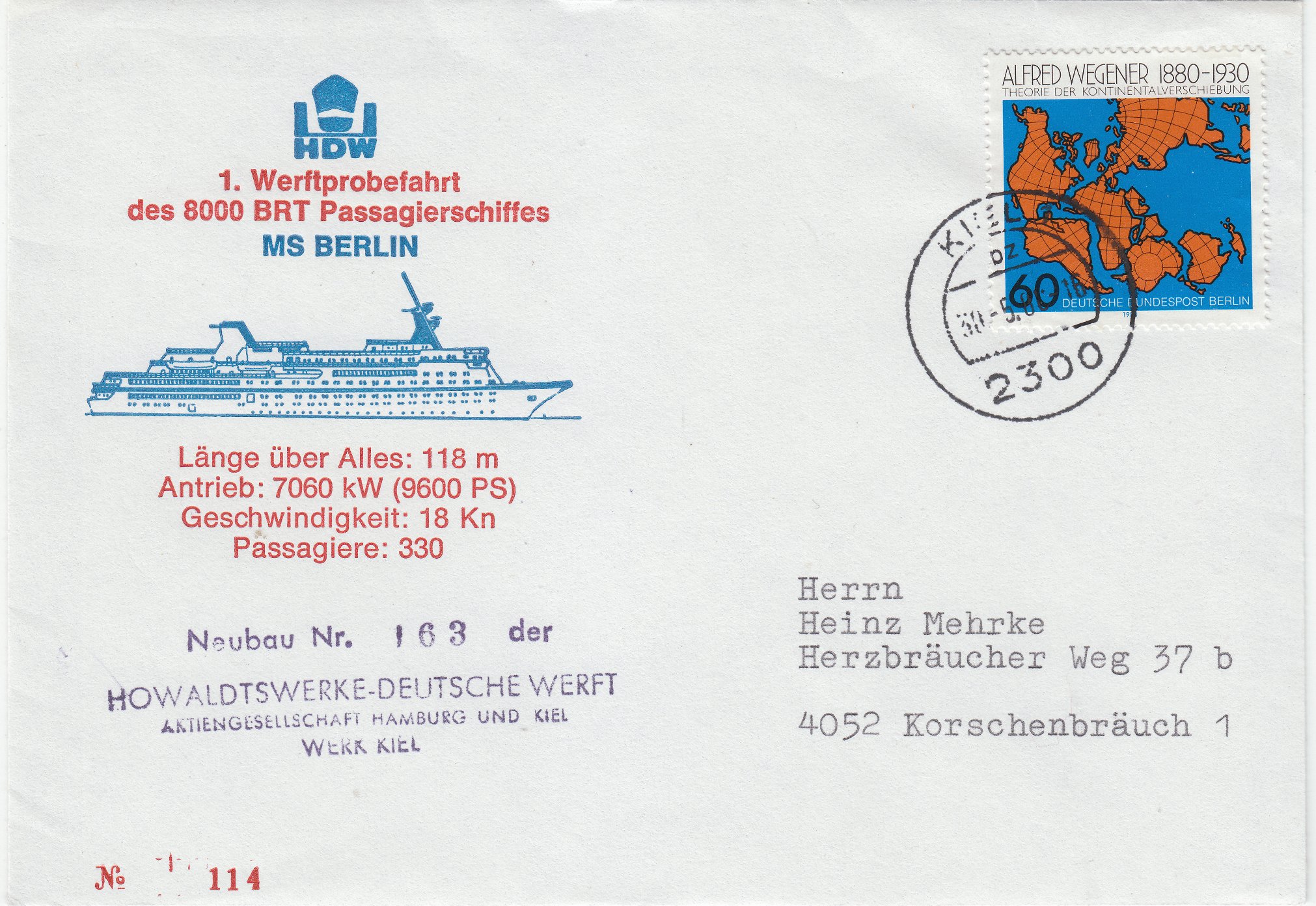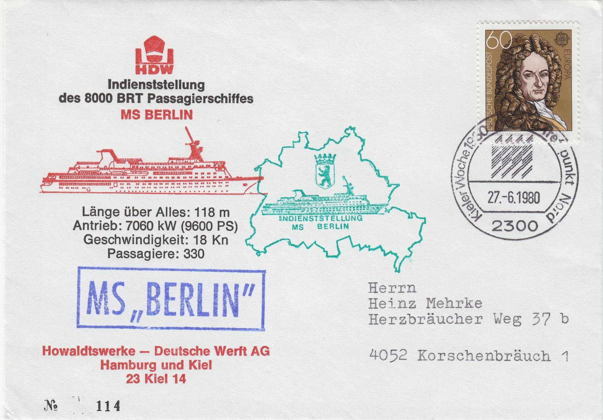 Den Stapellauf der MS BERLIN als "Neubau Nr. 163 der Howaldtswerke - Deutsche Werft AG Hamburg und Kiel, Werk Kiel" am 12.01.1980, dokumentiert dieser Beleg: