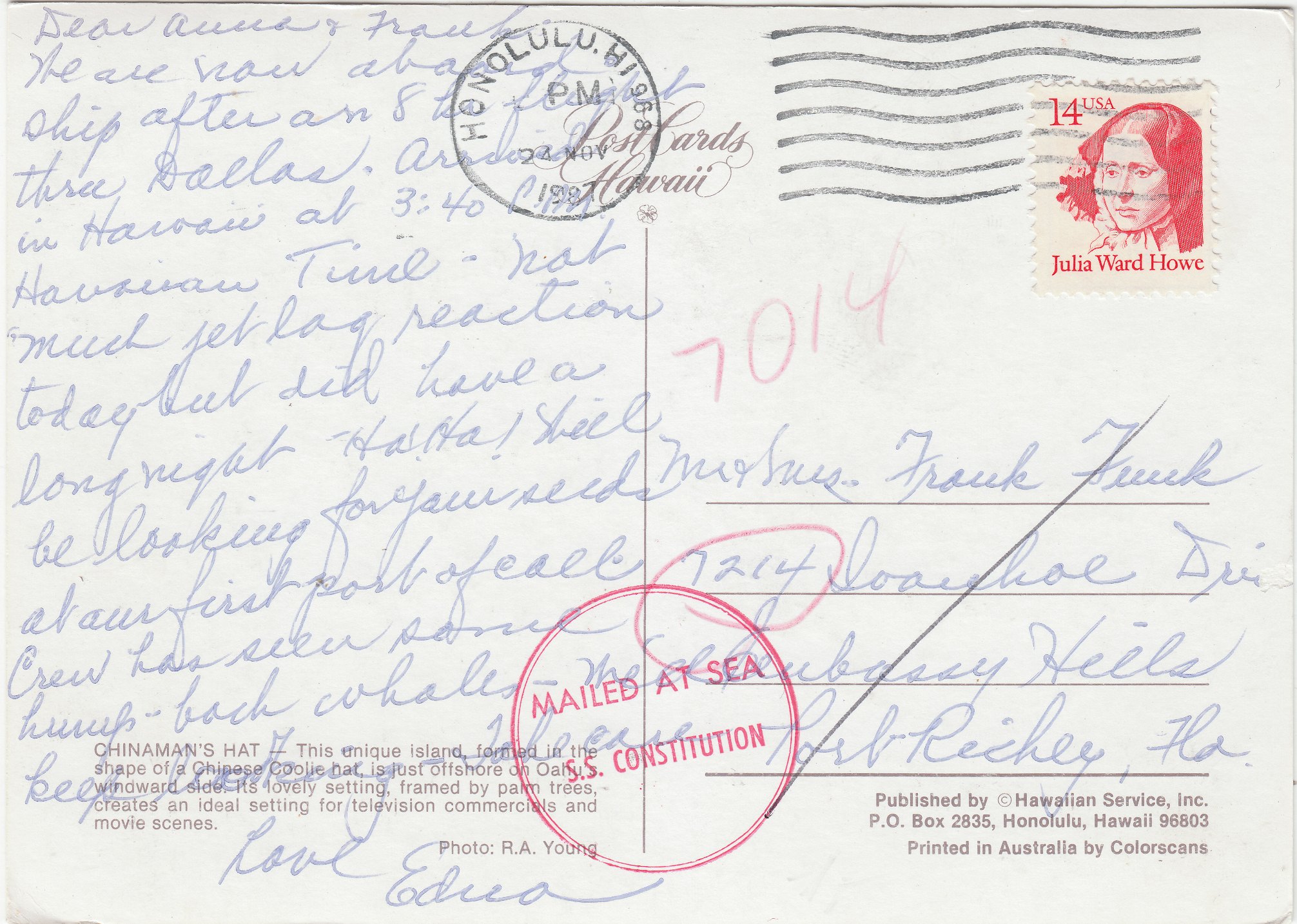 Die SS CONSTITUTION war ein Kreuzfahrtschiff, das von 1982 bis 1997 der Firma "American Hawaii Cruises" gehörte. Diese Postkarte wurde an Bord des Schiffes aufgegeben, worauf ein Bordstempel in Rot "MAILED AT SEA S.S. CONSTITUTION" hinweist. Der Beleg wurde dann am 24.11.1987 in Honolulu, Hawaii, der US-amerikanischen Post zur weiteren Beförderung übergeben und die Frankatur wurde dort per Maschinenstempel entwertet:
