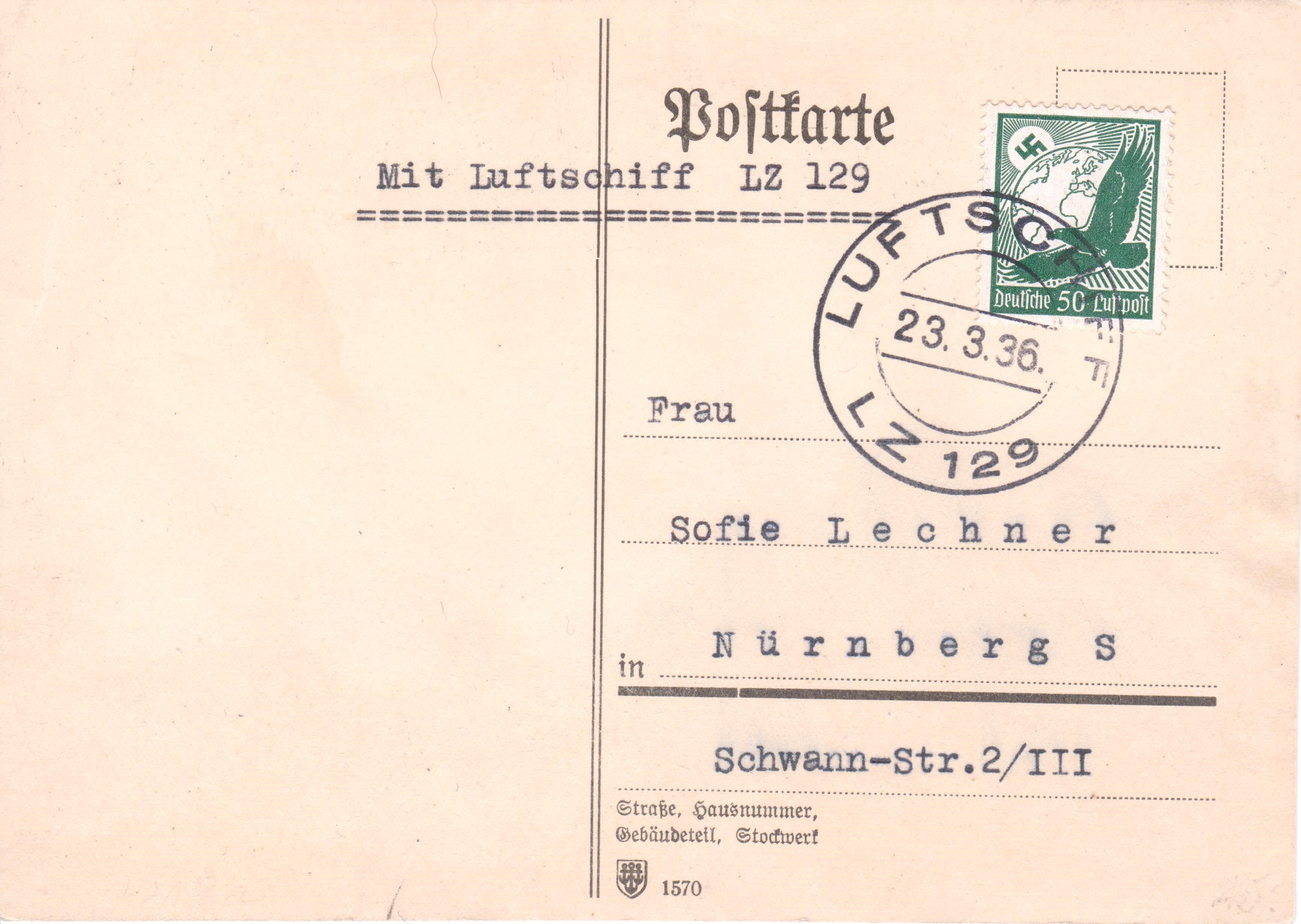 Die Frankatur dieser Postkarte wurde am 23.3.36 mit dem Bordstempel LUFTSCHIFF LZ 129 entwertet: