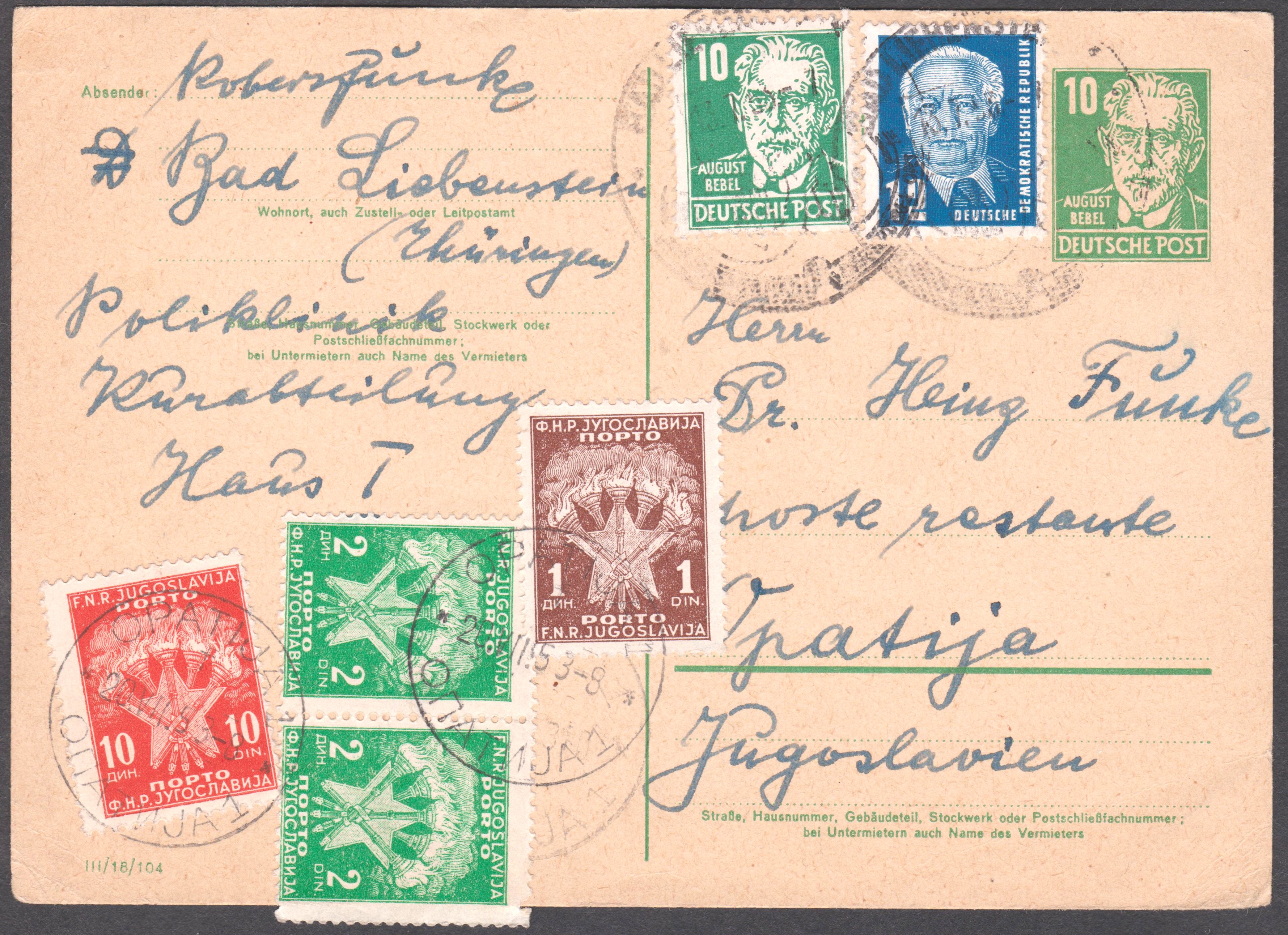 Diese nach Jugoslawien adressierte Ganzsache aus der DDR mit eingedrucktem Postwertzeichen der Wertstufe 10 Pf wurde mit zwei Postwertzeichen zu 10 Pf sowie 12 Pf als Zusatzfrankatur versehen am 13.07.1953 in Bad Liebenstein (Thüringen) aufgegeben: