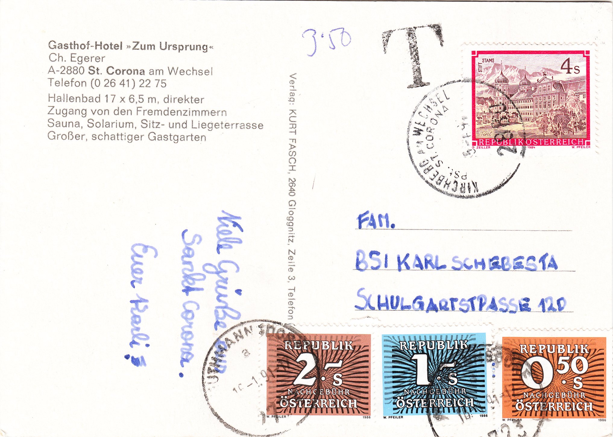 Dieser Brief war unterfrankiert, denn die korrekte Portostufe betrug 90 Lire. Der Brief wurde daher in Italien mit einem Taxstempel "T" versehen, neben den handschriftlich der Bruch "80/90" vermerkt wurde entsprechend dem Doppelten Betrag des Fehlportos dividiert durch die Portostufe. In RIED in Tirol wurden 3 Schilling 10 Groschen als Nachporto erhoben und entsprechende Portomarken verklebt, die mit Tagesstempel am 28.09.1970 entwertet wurden!