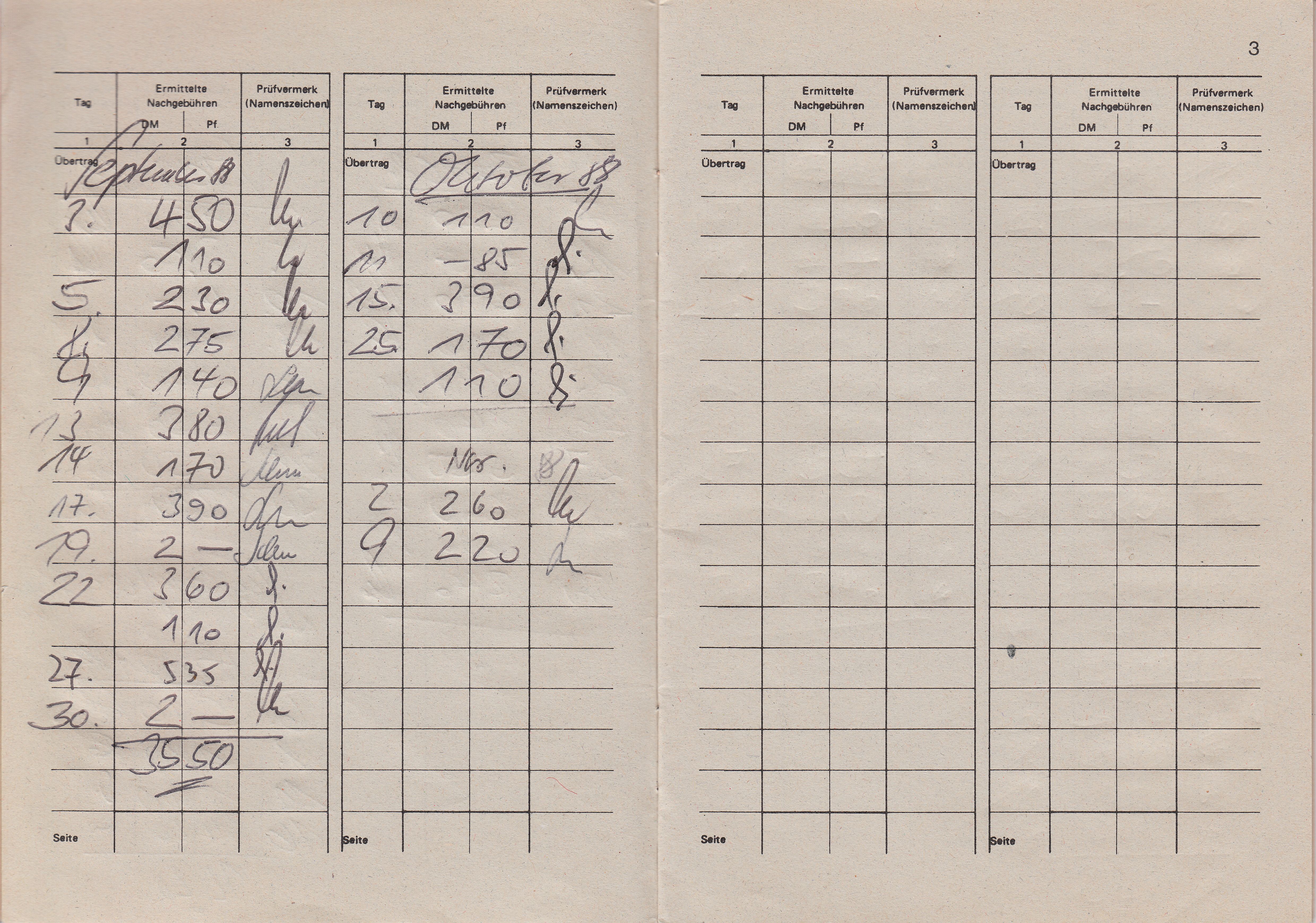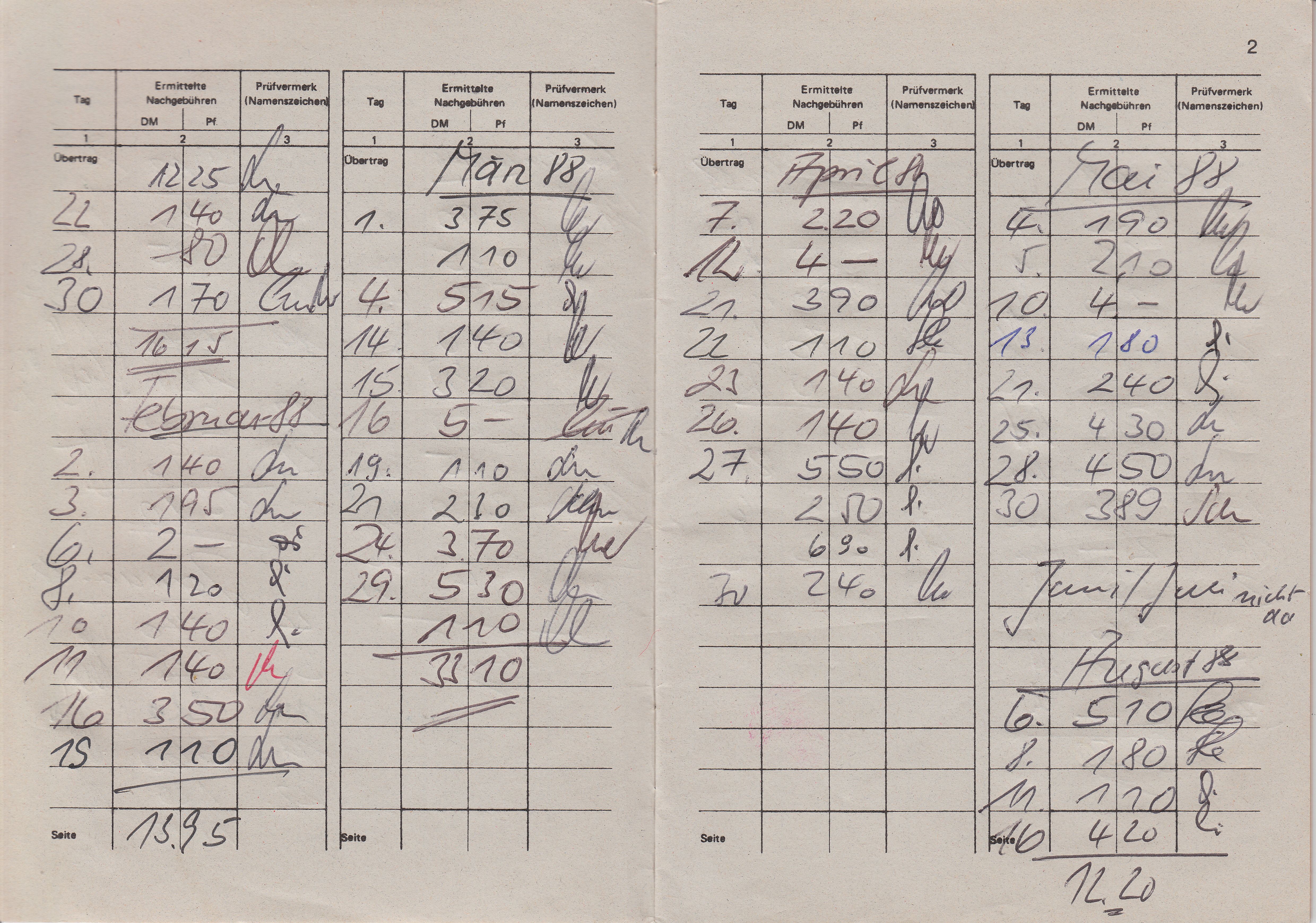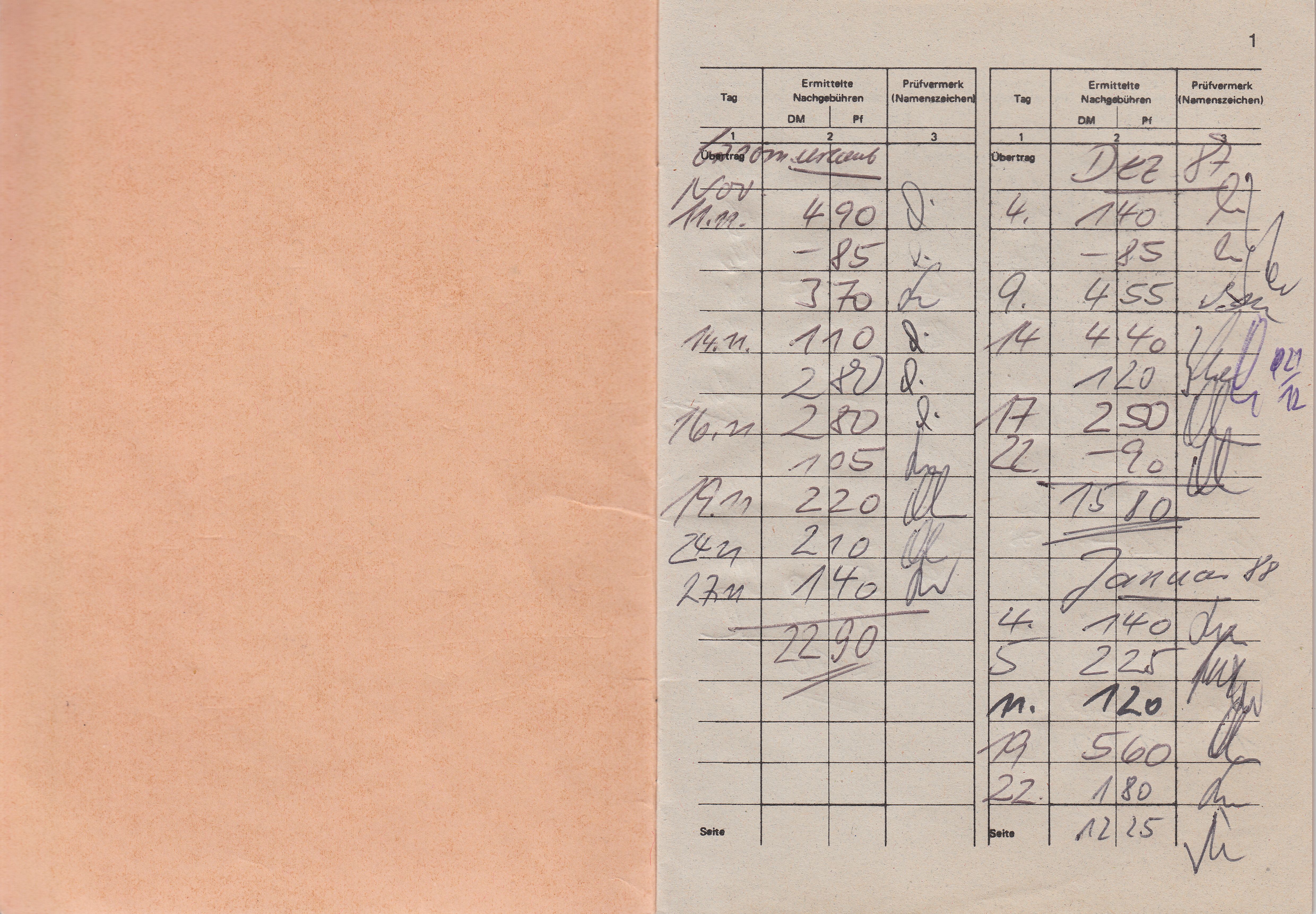 Hier ein "Nachgebühren-Merkbuch", ausgegeben vom Postamt "8728 Haßfurt" am 29.10.1987 an einen "Verteiler" mit dem Namen "H. Gunzelmann" sowie die ausgefüllten ersten Seiten daraus: