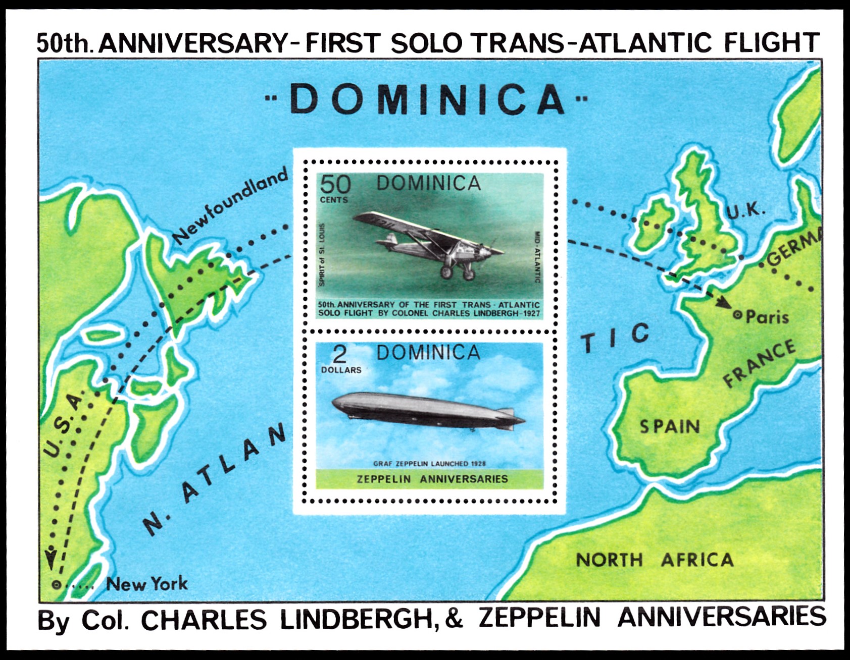 Die Marke ist zusammen mit einer Marke zum 50. Jahrestag des 1. Transatlantikfluges von Charles Lindbergh in einem Block (MiNr 48) erschienen.