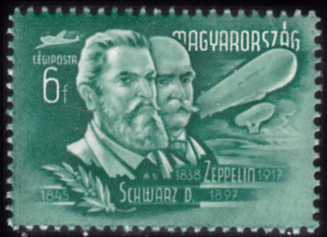 Auf einer Marke aus Ungarn (MiNr 1015) werden Porträts von David Schwarz und Graf Zeppelin, sowie das Luftschiff von Schwarz und LZ 127 "Graf Zeppelin" gezeigt.