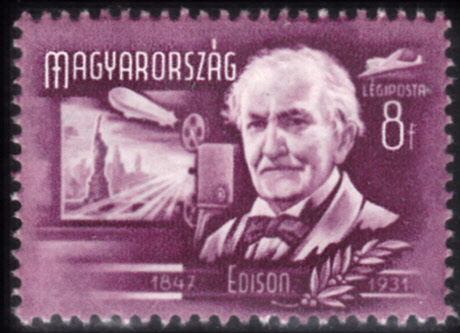 In der gleichen Serie "Erfinder und Entdecker" aus Ungarn kommt auch diese Marke, die Thomas Alva Edison (1847-1931; (vielfacher Erfinder) und einen Kinematographen zeigt, der auf eine Leinwand im Hintergrund ein Bild mit LZ 127 über der Freiheitstatue wirft.