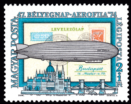 Zur Internationalen Flugpostmarken-Ausstellung AEROFILA ’74 in Budapest ist in Ungarn diese Marke (MiNr 2987 A) mit dem Luftschiff LZ 127n und einem Zeppelinbrief aus dem Jahre 1931.