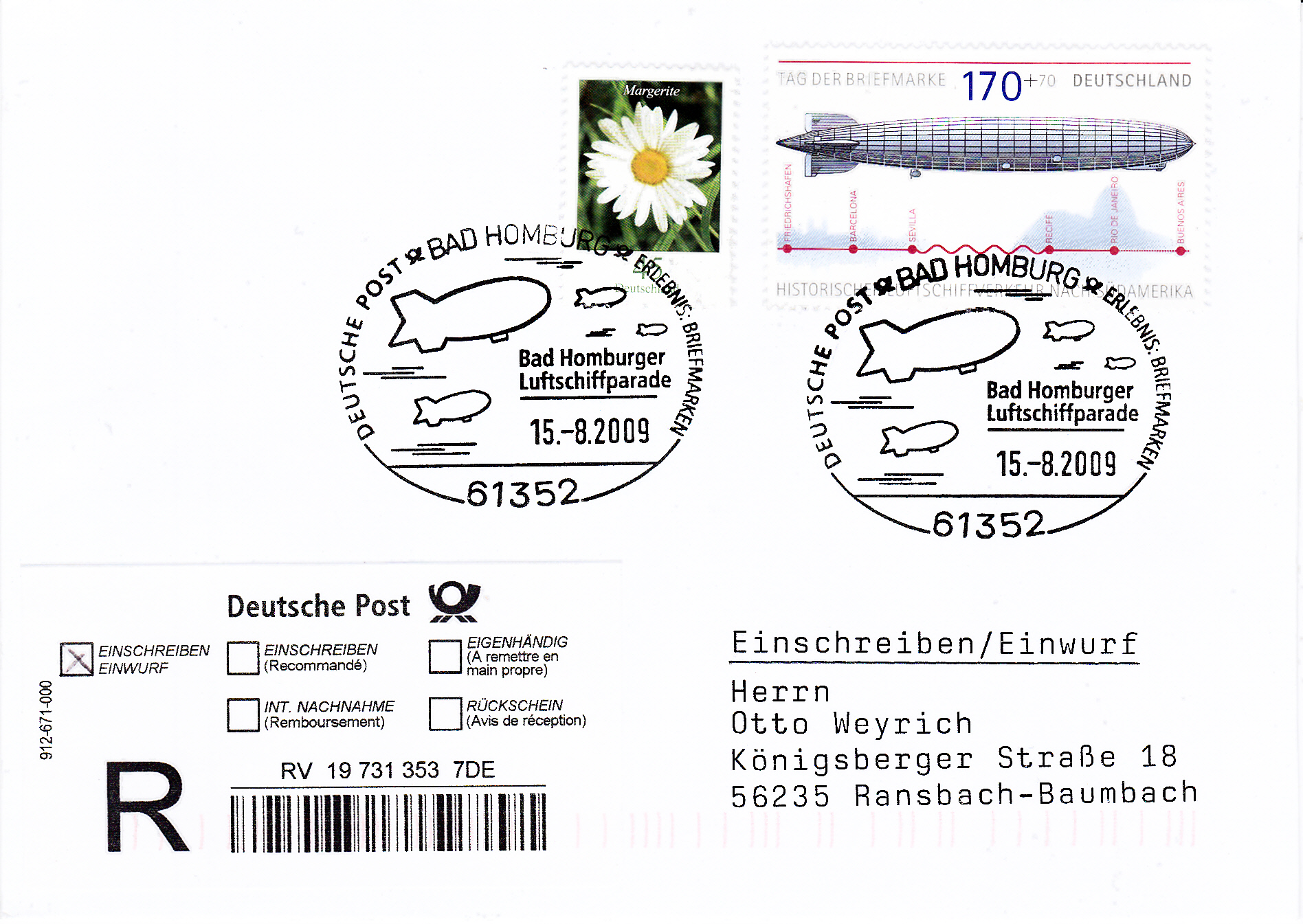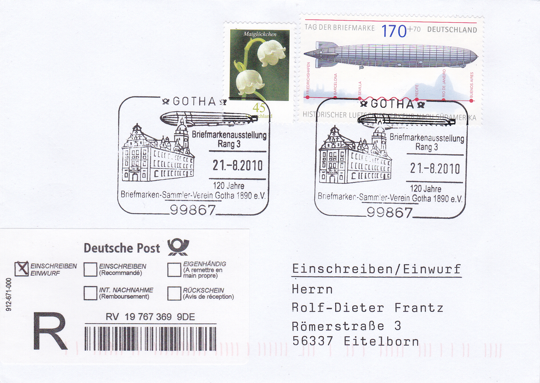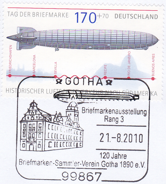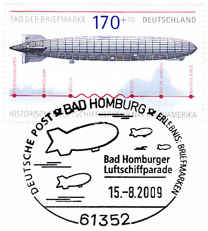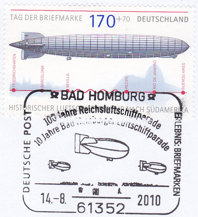 Einwurf-Einschreiben mit der Marke (MiNr 2589) aus dem Block zum Tag der Briefmarke (MiNr Block 69) mit LZ 127 und einem Sonderstempel aus Bad Homburg vom 14.8.2010 zu den Jubiläen "100 Jahre Reichsluftschiffparade" und "10 Jahre Bad Homburger Luftschiffparade".