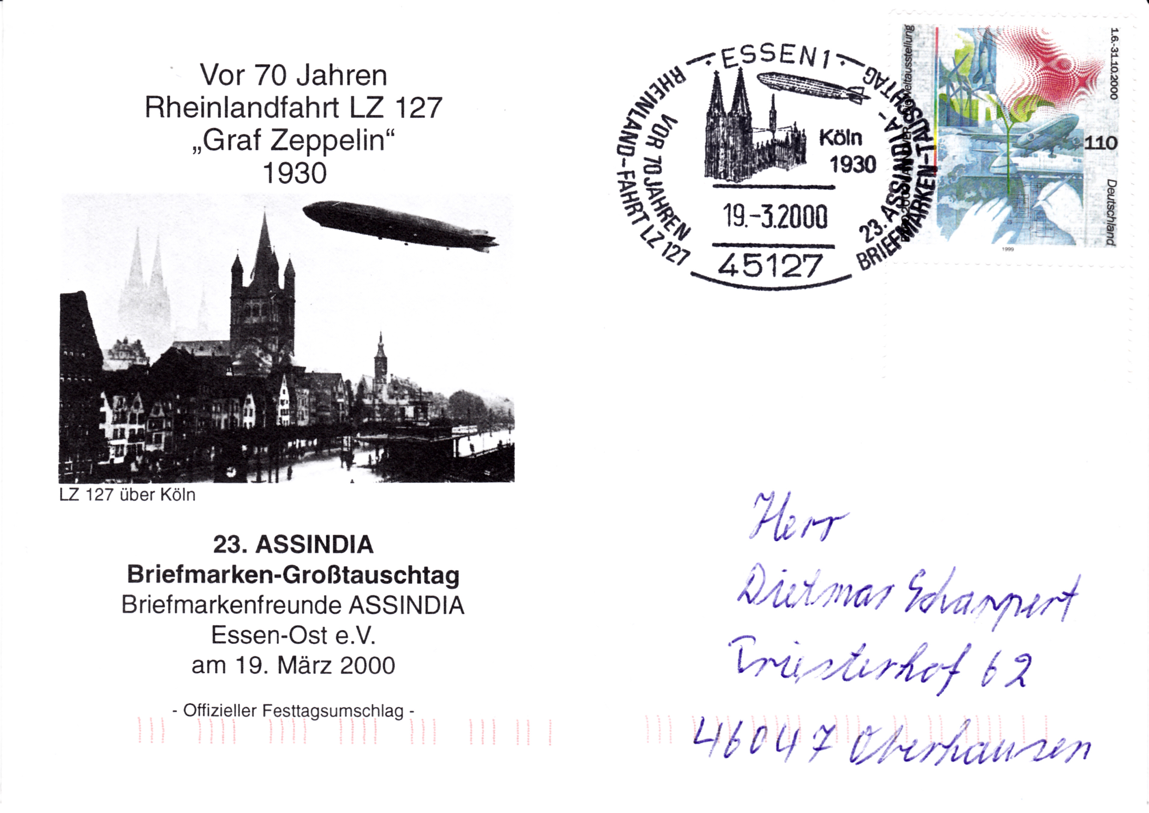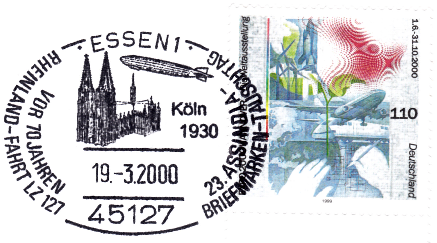 Sonderstempel aus Essen zum Thema "70 Jahre Rheinlandfahrt LZ 127". Der Stempel zeigt LZ 127 und den Kölner Dom.