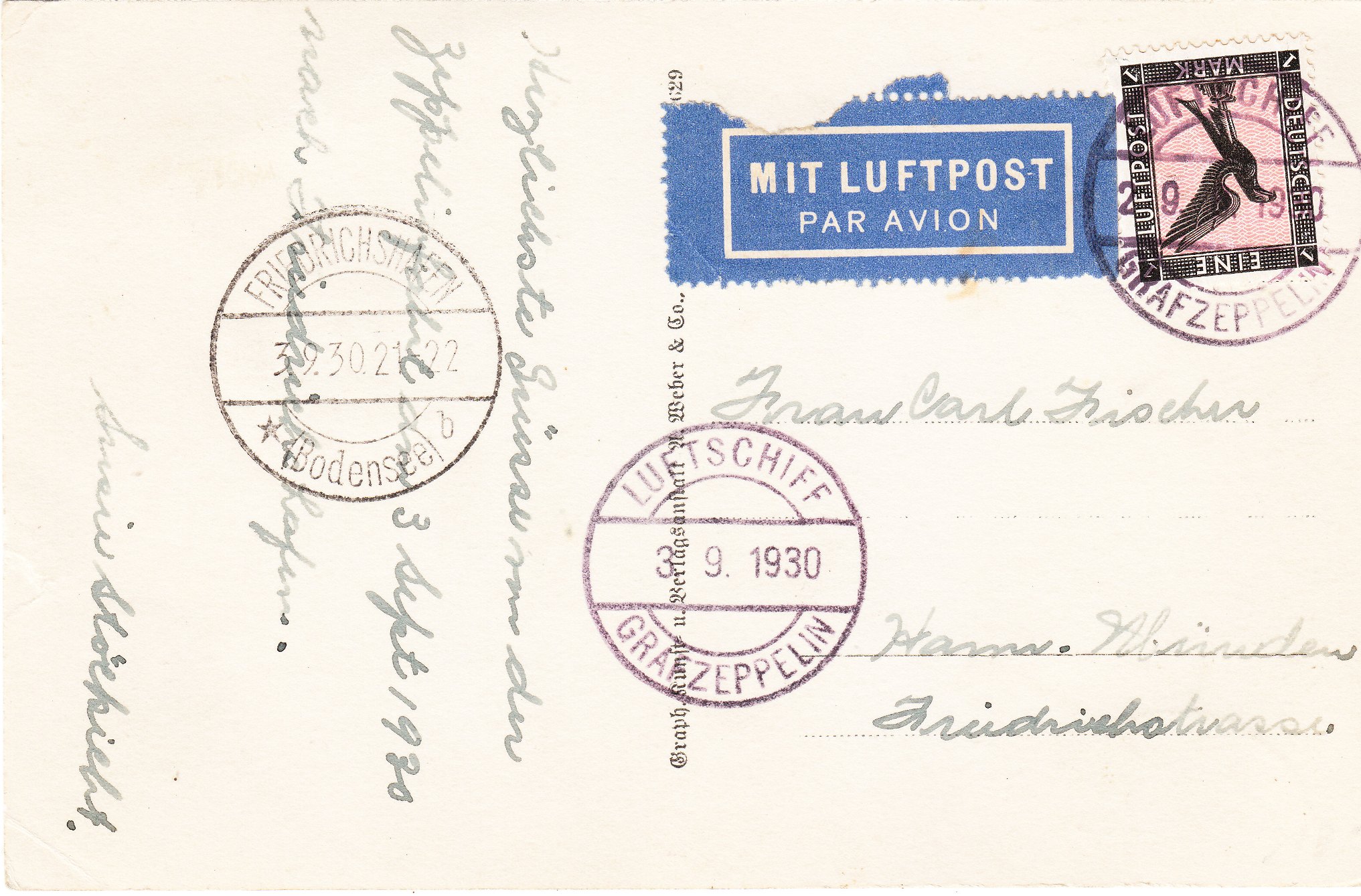 Dieser mit einer Mark frankierte Beleg wurde geschrieben von "Susie Stöckicht" als einem der 25 Passagiere des Luftschiffes "GRAF ZEPPELIN" und die Frankatur wurde am 02.09.1930 mit dem Bordstempel des Zeppelins entwertet. Die am 02./03.09.1930 durchgeführte Fahrt wurde durch einen weiteren Bordstempel am 03.09.1930 sowie einen Ankunftsstempel "FRIEDRICHSHAFEN 3.9.30. 21-22" dokumentiert: