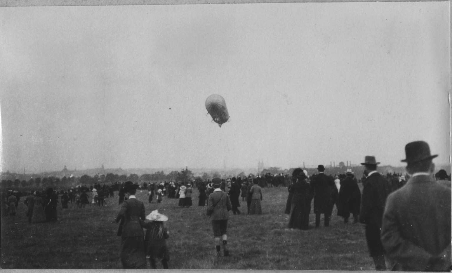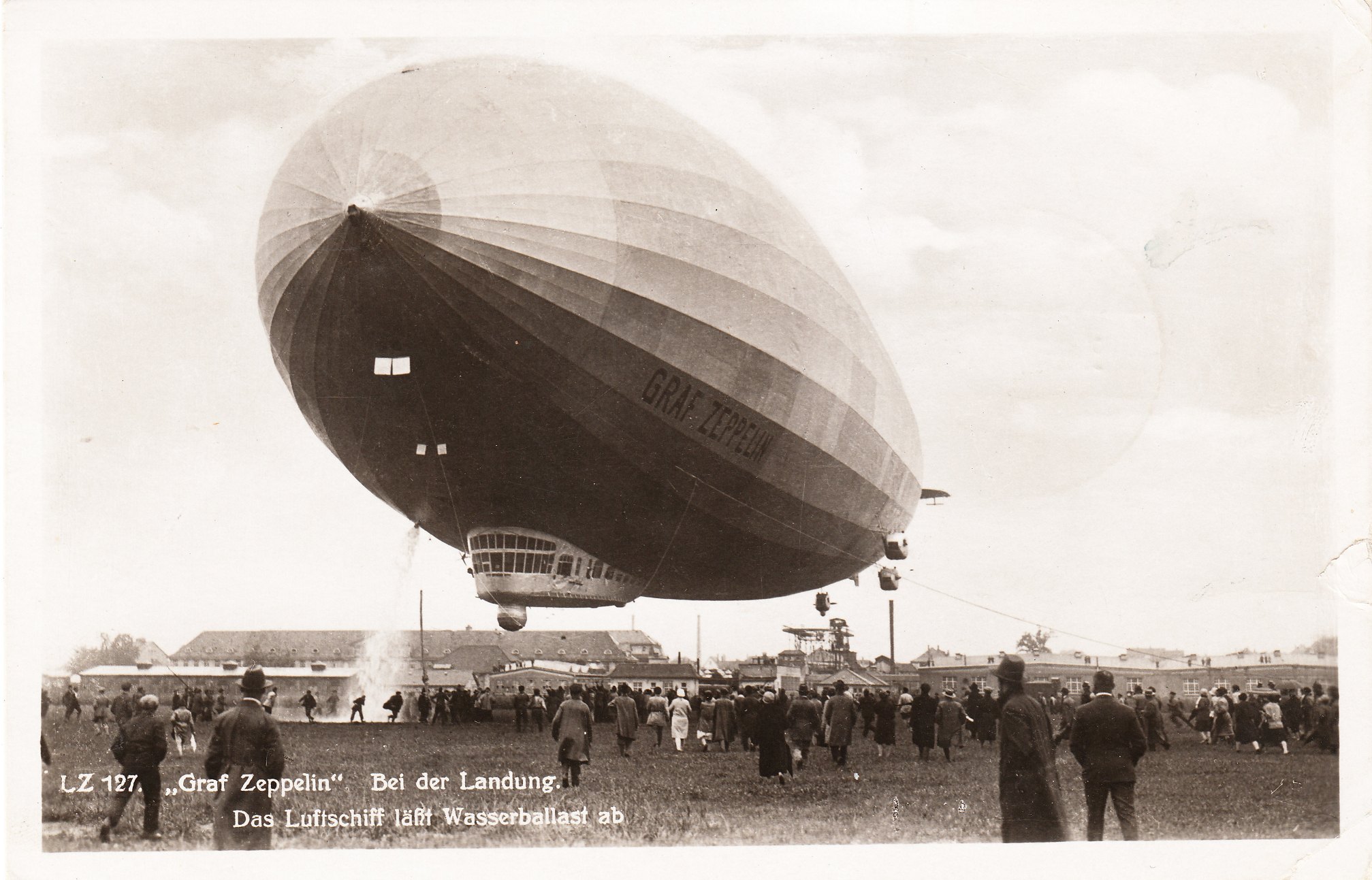 Nach seinem Start in Friedrichshafen sowie einer Fahrt über Stuttgart und Frankfurt schwebte das Luftschiff schließlich gegen 8 Uhr über dem Kasseler Flugplatz in Waldau ein. Hier ein Originalbild, das den Zeppelin bei der Landung in Waldau zeigt (Quelle:Stadtmuseum):