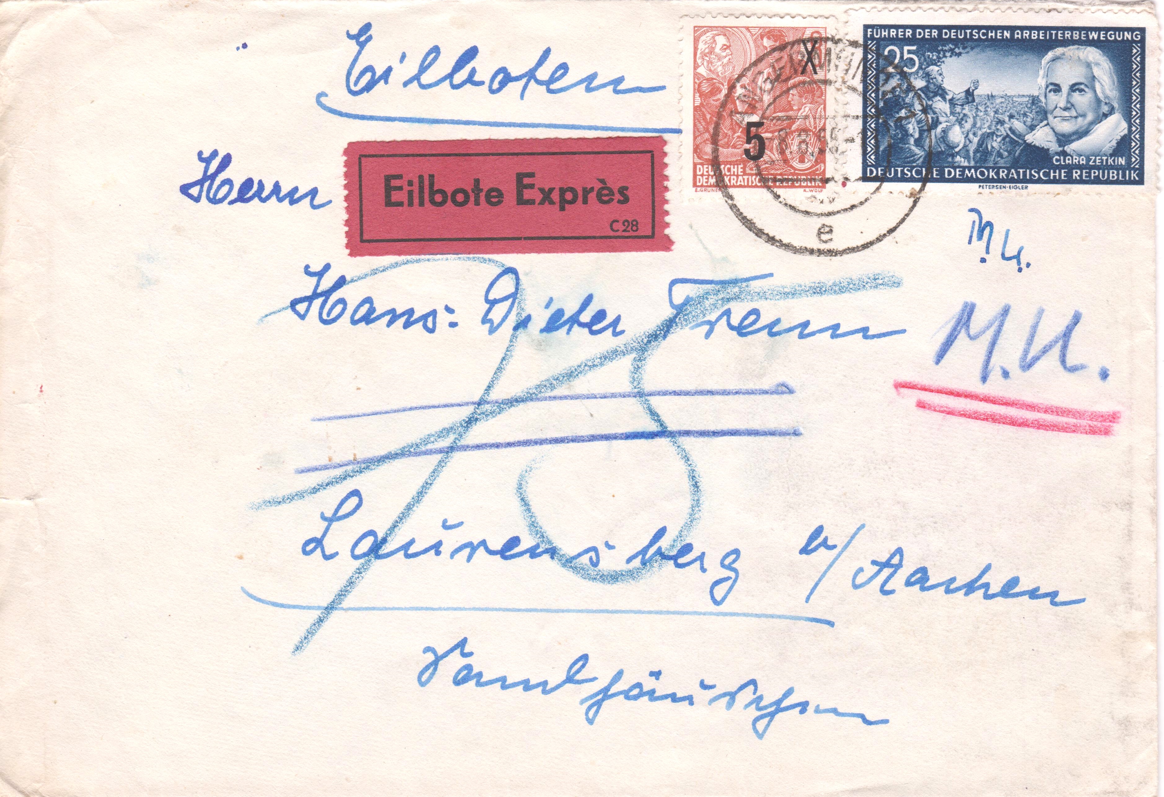 Dieser nach Laurensberg adressierte Brief per Eilboten wurde am 08.08.1955 in ANGERMÜNDE aufgegeben. Die vorderseitig angebrachte Frankatur von 30 Pf wurde per Tagesstempel entwertet: