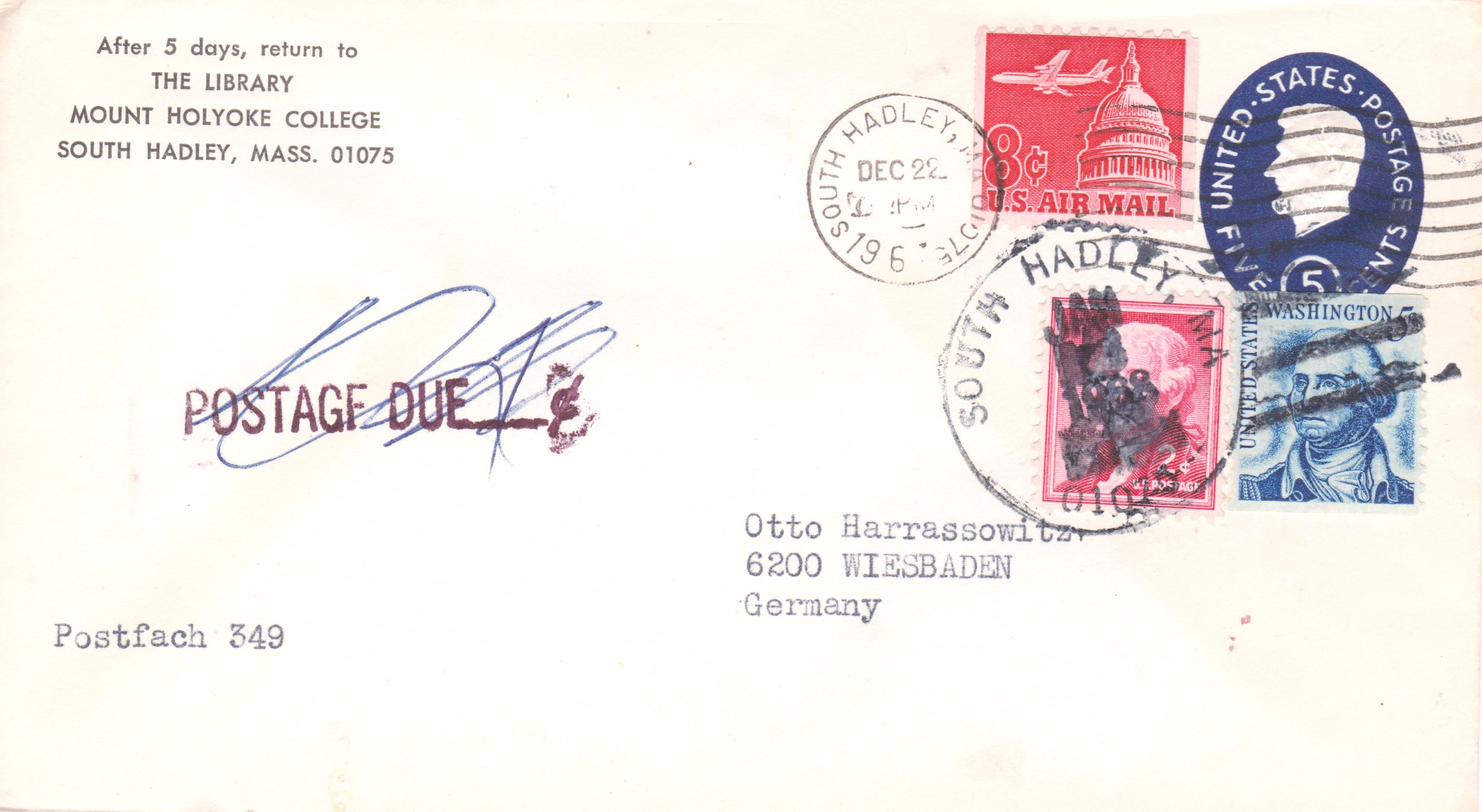 Dieser nach "6200 WIESBADEN Germany" adressierte Ganzsachenumschlag mit eingedrucktem Postwertzeichen zu 5 Cents wurde mit einer Zusatzfrankatur von 8 Cents versehen am 22.12.1967 in SOUTH HADLEY, MASS. aufgegeben: