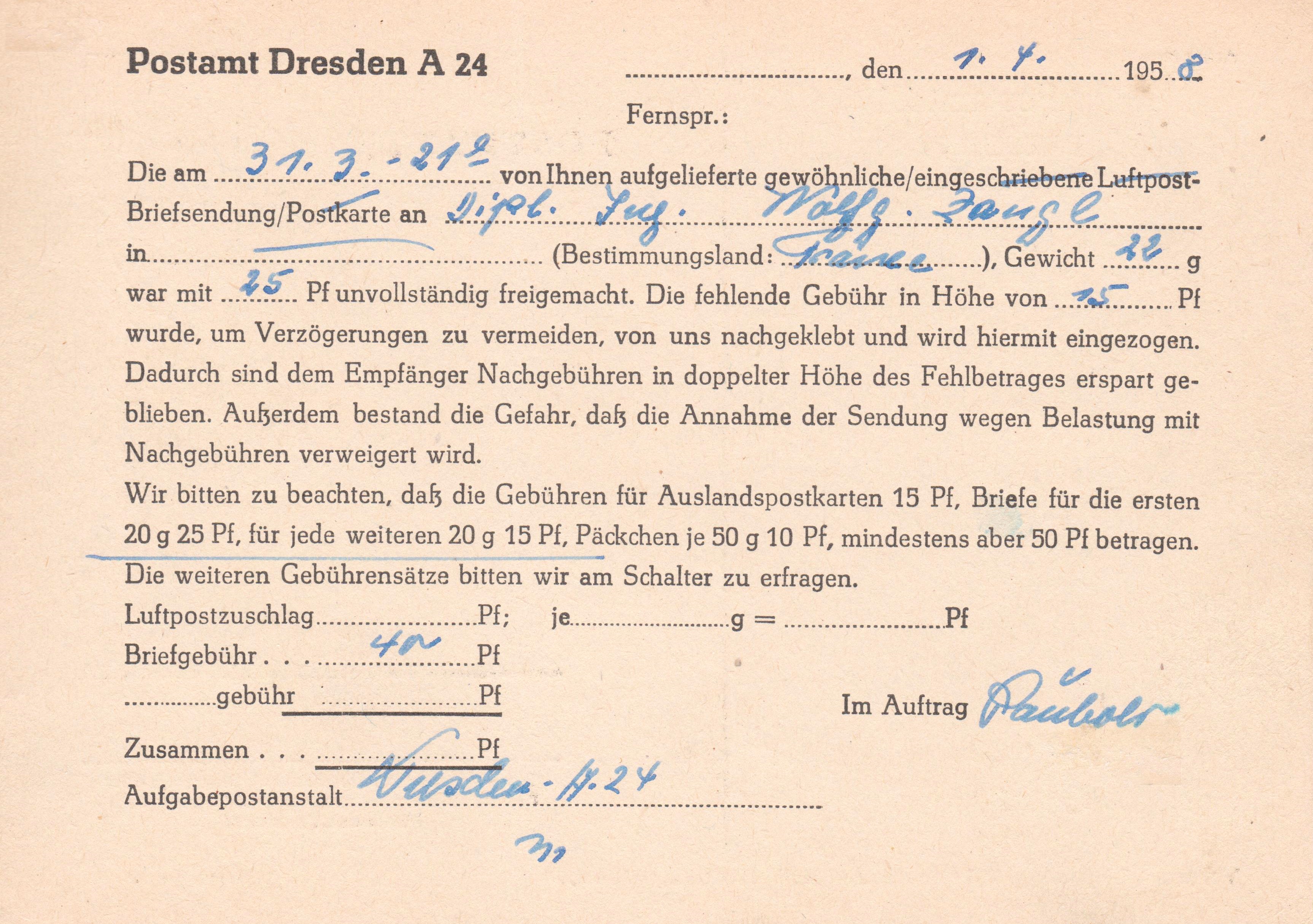 Formular "POSTKARTE" vom Postamt 24 in DRESDEN A 24 mit 15 Pf NACHGEBÜHR, nachträglich beim Absender erhoben für einen Brief nach Frankreich, der "22 g wog, aber lediglich mit 25 Pf für einen Brief mit einem Gewicht bis zu 20 g freigemacht worden war: