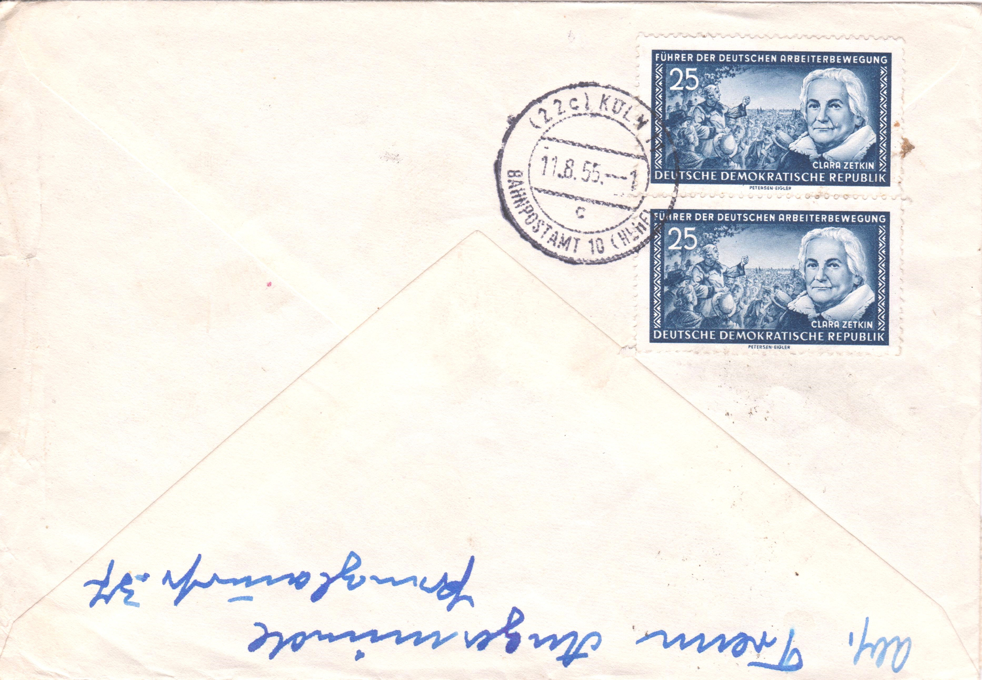 Dieser nach Laurensberg adressierte Brief per Eilboten wurde am 08.08.1955 in ANGERMÜNDE aufgegeben. Die vorderseitig angebrachte Frankatur von 30 Pf wurde per Tagesstempel entwertet: