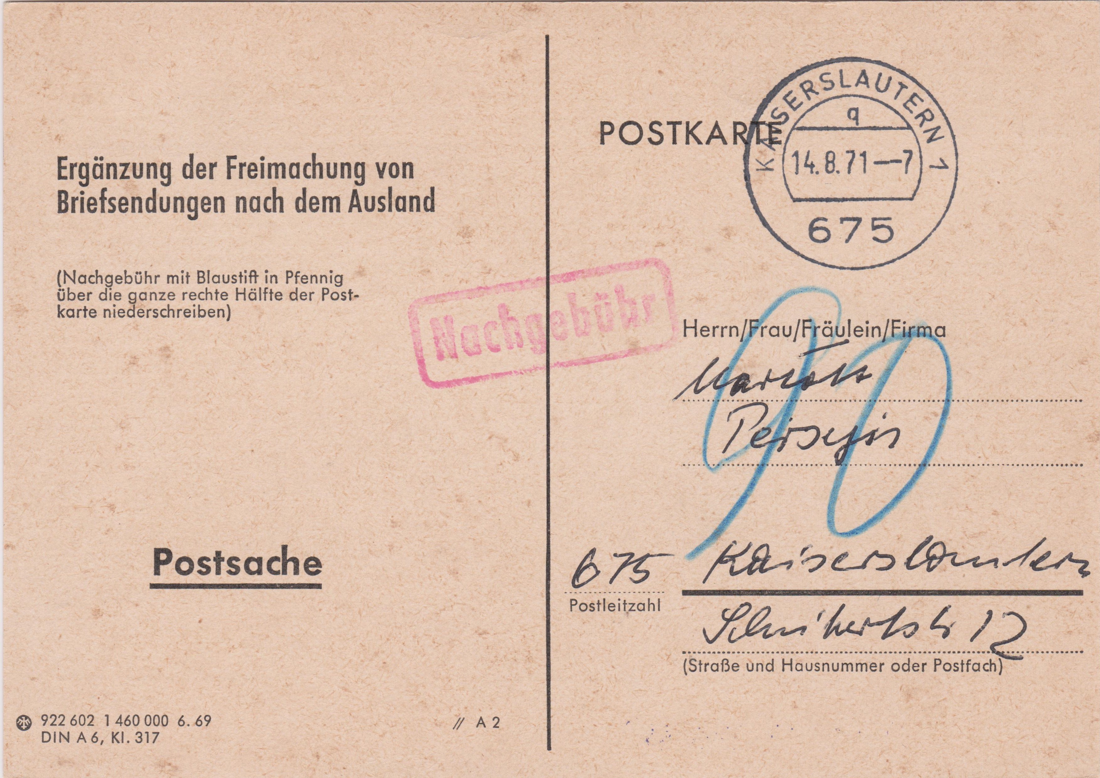 Dieser Brief wurde daher, nachdem die Überschreitung der für einen Maxibrief maximalen Höhe im BZ 70 erkannt wurde, zur Ergänzung der Freimachung um 2,20 € an den Absender zurück geleitet. Dazu wurde über den Adreßaufkleber ein entsprechender Aufkleber "Deutsche Post" angebracht, von dem rechts vom Adreßaufkleber nur noch ein kleiner Rest auf dem Beleg übrig geblieben ist.
